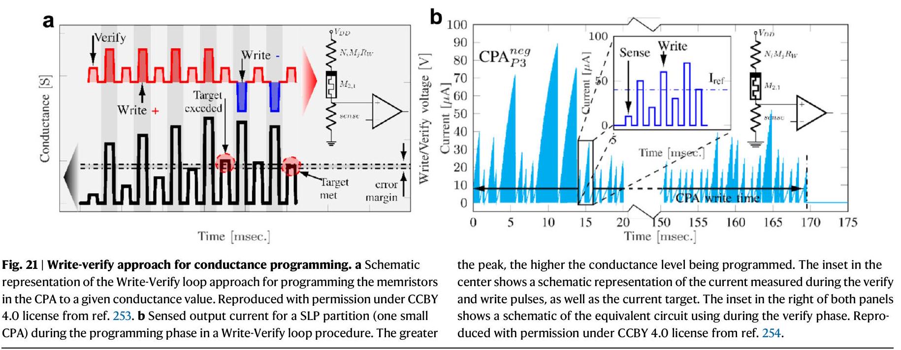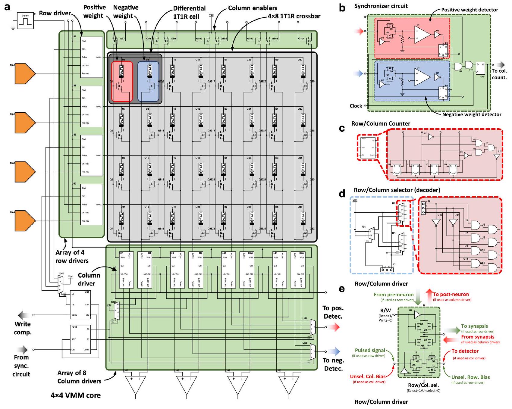 to enable the memristor addressed by the address block. e Row and column driver, used to bias the rows with the voltage input or with the programming signal, and to connect the columns to the output neurons (during inference) or the sense amplifier (during write-verify).