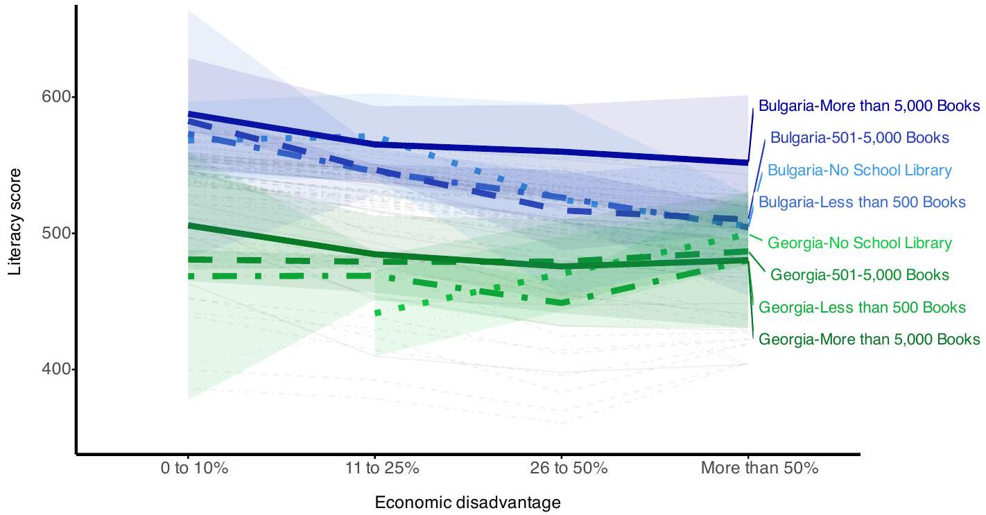 تقديرات التأثيرات العشوائية للمدرسة حسب البلد معقدة (الشكل 7): سنركز على تباين معين بين بلغاريا وجورجيا (النتائج الملونة في الشكل 7). هذه المقارنة مثيرة للاهتمام لأن هذين البلدين يبدو أنهما لديهما أنماط مختلفة من تفاعل المكتبة والحرمان الاقتصادي (الشكل 4). النمط الأكثر وضوحًا الذي يظهر في مخطط التفاعل (الشكل 4) هو أن الطلاب من بلغاريا (الخطوط الزرقاء) لديهم