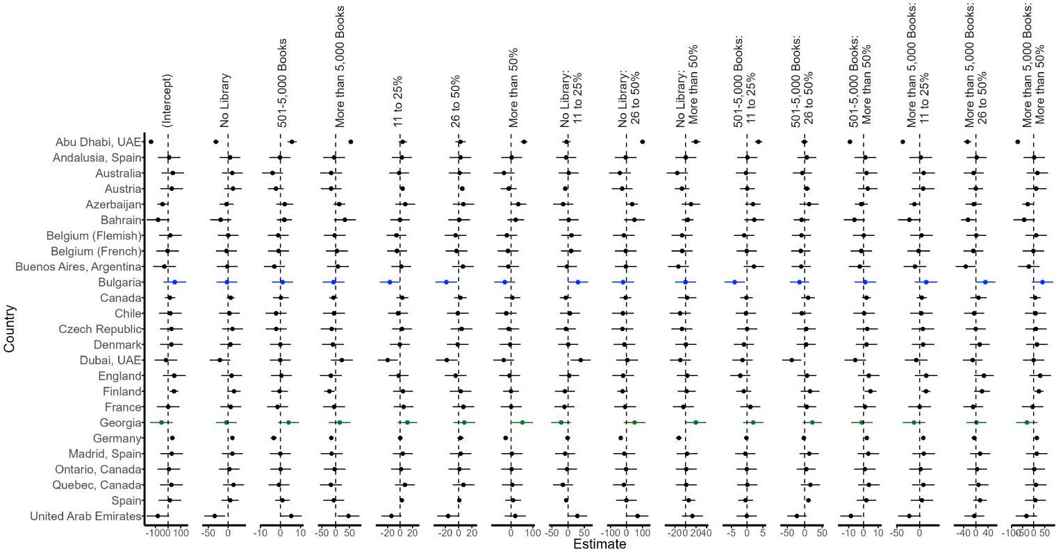The conditional estimates of the school random effects by country are complex (Figure 7): we will focus on a particular contrast between Bulgaria and Georgia (colored results in Figure 7). This comparison is of interest because these two countries appear to have different patterns of library-economic disadvantage interaction (Figure 4). The most obvious pattern shown in the interaction plot (Figure 4) is that students from Bulgaria (blue lines) have