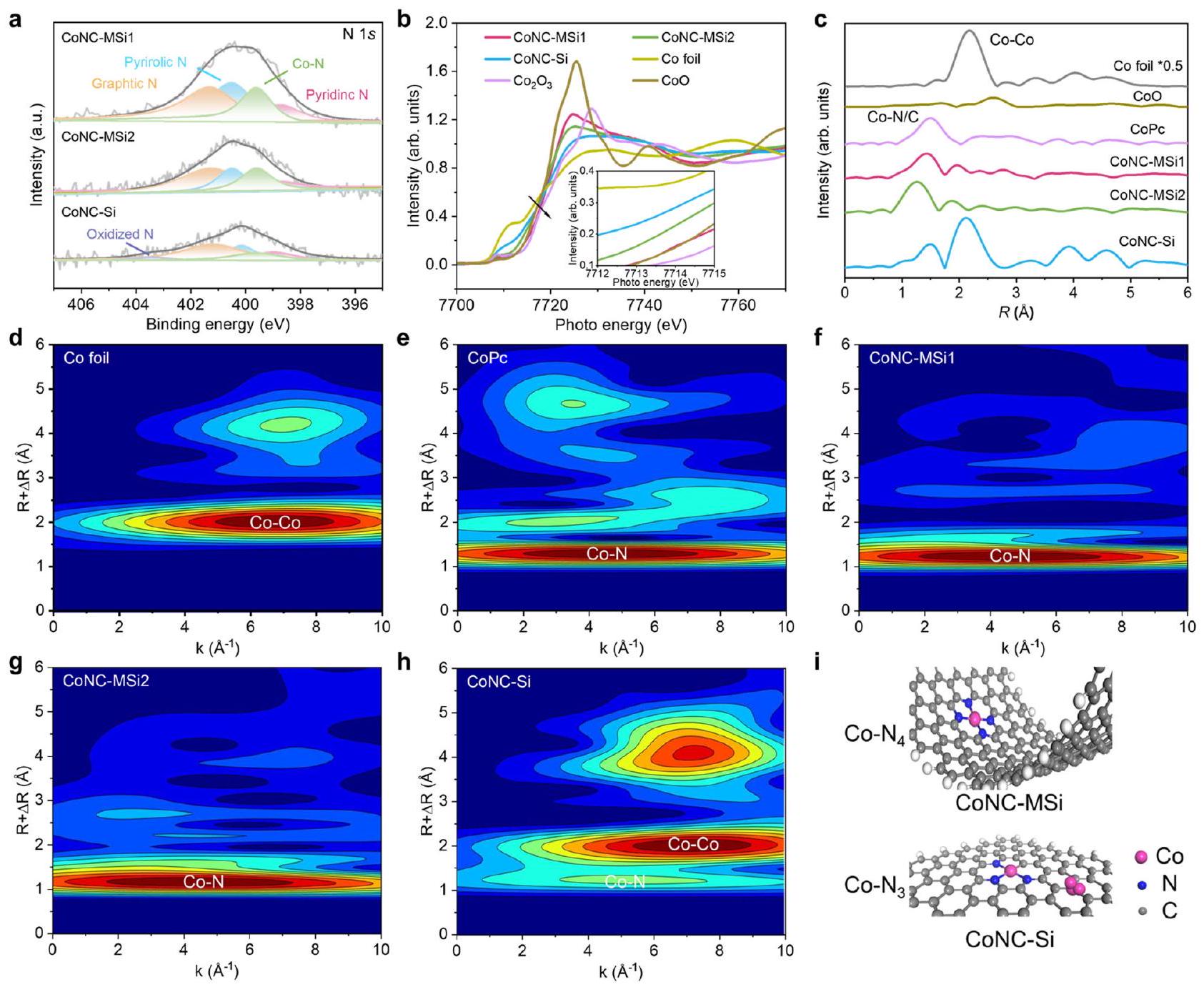 spectra of the Co SACs and reference samples (Co foil, CoO, and CoPc). d-h WTEXAFS plots of different catalysts. i Schematic diagram of coordination configurations of the Co SACs.
