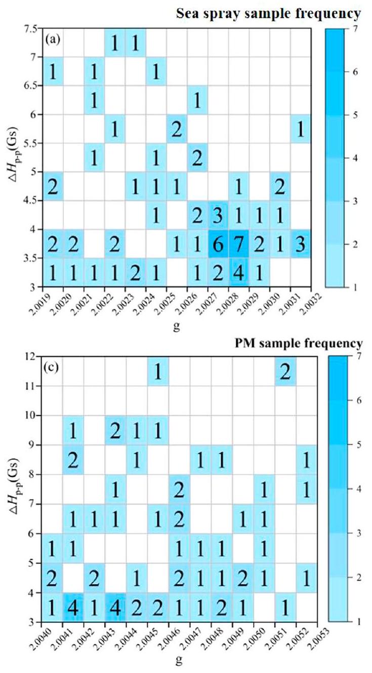 الجذور الحرة المركزية الكربونية بالقرب من الأكسجين (مثل 3،4-ميثوكسي فينيل)، والجذور الحرة المركزية الأكسجينية (مثل الجذور الحرة هيموكينون) . المعلمات المهمة لتحديد نوع EPFR هي -عامل وعرض الخط . كلما اقترب الإلكترون الحر من ذرة الأكسجين، زادت قيمة -عامل . تراوح -عامل EPFRs في عينات رذاذ البحر بين 2.0019 إلى 2.0032، بقيمة متوسطة قدرها ، وتركزت بشكل رئيسي في 2.0025-2.0030، والتي تمثل من إجمالي 64 عينة (الشكل 2a). تظهر النتائج أن أنواع EPFRs في رذاذ البحر هي بشكل رئيسي جذور حرة مركزية كربونية. تراوح -عامل EPFRs في PM المفصول حسب الحجم بين 2.0040 إلى 2.0053، بقيمة متوسطة قدرها ، وتركزت بشكل رئيسي في 2.0041 إلى 2.0047، والتي تمثل من إجمالي 72 عينة (الشكل 2c). أظهرت النتائج أن أنواع EPFRs في PM كانت بشكل رئيسي جذور حرة مركزية أكسجينية. الجذور الكربونية المركزية تتأكسد بسهولة في الغلاف الجوي، بينما الجذور الأكسجينية المركزية مستقرة في الغلاف الجوي . لذلك، فإن EPFRs في رذاذ البحر أكثر تفاعلية من تلك الموجودة في PM. كميزة أخرى للمعلومات عن EPFRs، عرض الخط ( ) هو طريقة قياسية لقياس عرض طيف EPR، والتي يمكن استخدامها لتعكس بنية جزيئات السلف . كانت القيمة المتوسطة لـ لـ EPFRs في رذاذ البحر هي ، وتركزت بشكل رئيسي في النطاق من ، والتي تمثل من إجمالي 64 عينة (الشكل 2a). كانت القيمة المتوسطة لـ لـ EPFRs في PM هي ، وتركزت بشكل رئيسي في النطاق من ، والتي تمثل من إجمالي 72 عينة (الشكل 2c). بالإضافة إلى ذلك، سيؤثر نوع وتركيز الجذور الحرة على قيمة . في الدراسة الحالية، أظهرت EPFRs في عينات رذاذ البحر وعينات PM اتجاهًا لـ زيادة مع زيادة تركيز الجذور الحرة (الشكل 2b، d) ( ، على التوالي)، وهو ما يتماشى مع نتائج كيب.