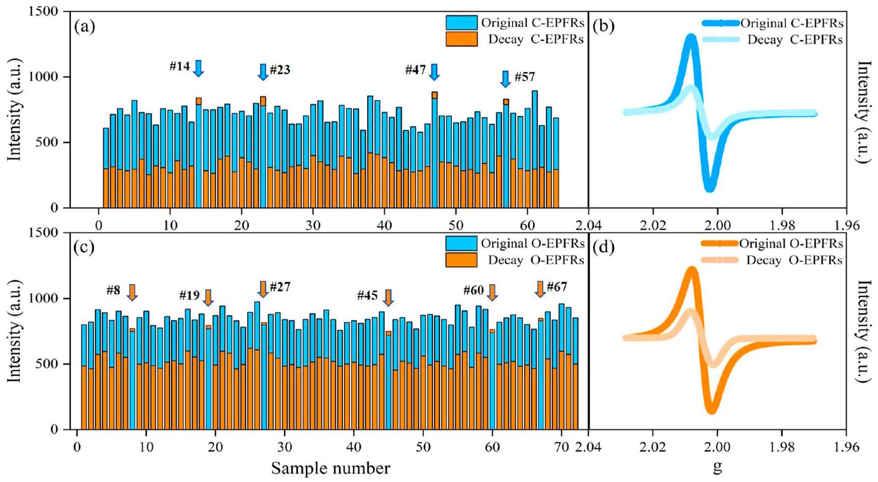 decay. c Yellow arrows represent PM samples with increased concentrations of EPFRs after decay. d Signals of EPFRs in PM samples before and after decay.