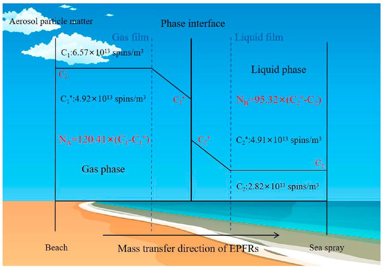 Based on the two-film theory, a detailed mass transfer process of the EPFRs between the gas and liquid phases was assumed. Owing to the sufficient turbulence of the fluid, the concentration of EPFRs in the gas and liquid phases is uniform from a macro point of view; that is, there is no concentration gradient in the gas and liquid phase environments. The concentration of EPFRs in the gas phase is the average concentration of EPFRs in the 72 size-resolved PM samples. The concentration of of the EPFRs in the liquid phase was the average concentration of the EPFRs in the 64 sea spray samples. Through molecular diffusion, EPFRs in the gas phase continuously enter the liquid phase through gas and liquid films. Similarly, the reverse process also exists. We assumed that the phase interface experienced no absorption resistance; that is, the concentration gradient was concentrated in the two film layers.