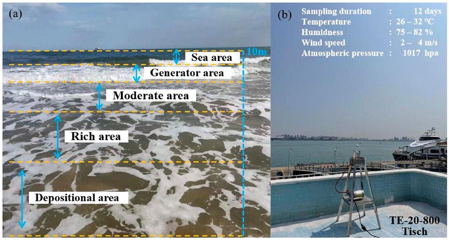Sea spray samples were collected from major coastal cities in southeastern China and a key hub in the local maritime transport system. According to data released by the local statistics bureau, Sea, with an area of approximately 390 square kilometres, with several natural goods ports, has been vital to foreign trade on the southeast coast of China. We performed sampling within 20-31 August 2023, with sampling locations in the Circular Island Road Beach and Rainbow Beach . Based on a predefined sampling area (Fig. 7a), In the unit area , the sea spray was first separated from the seawater by glass plates, then the upper sea spray was extracted by folding pump (S-82, Xiaomi, China), and finally collected into brown glass bottles. To explore the relationship between the sea spray and PM samples, an Anderson Stage Eight sampler (TE-20-800, Tisch, USA) was set up at a flow rate of adjacent to the sampling site to capture the size-distributed PM samples (Fig. 7b). The PM samples were collected on pre-baked quartz filters, and these filters were heated to 450 degrees Celsius for 4 h before the sampling process. Ultimately, 64 sea spray samples and 72 PM samples were preserved at a temperature of in the laboratory for subsequent analysis.