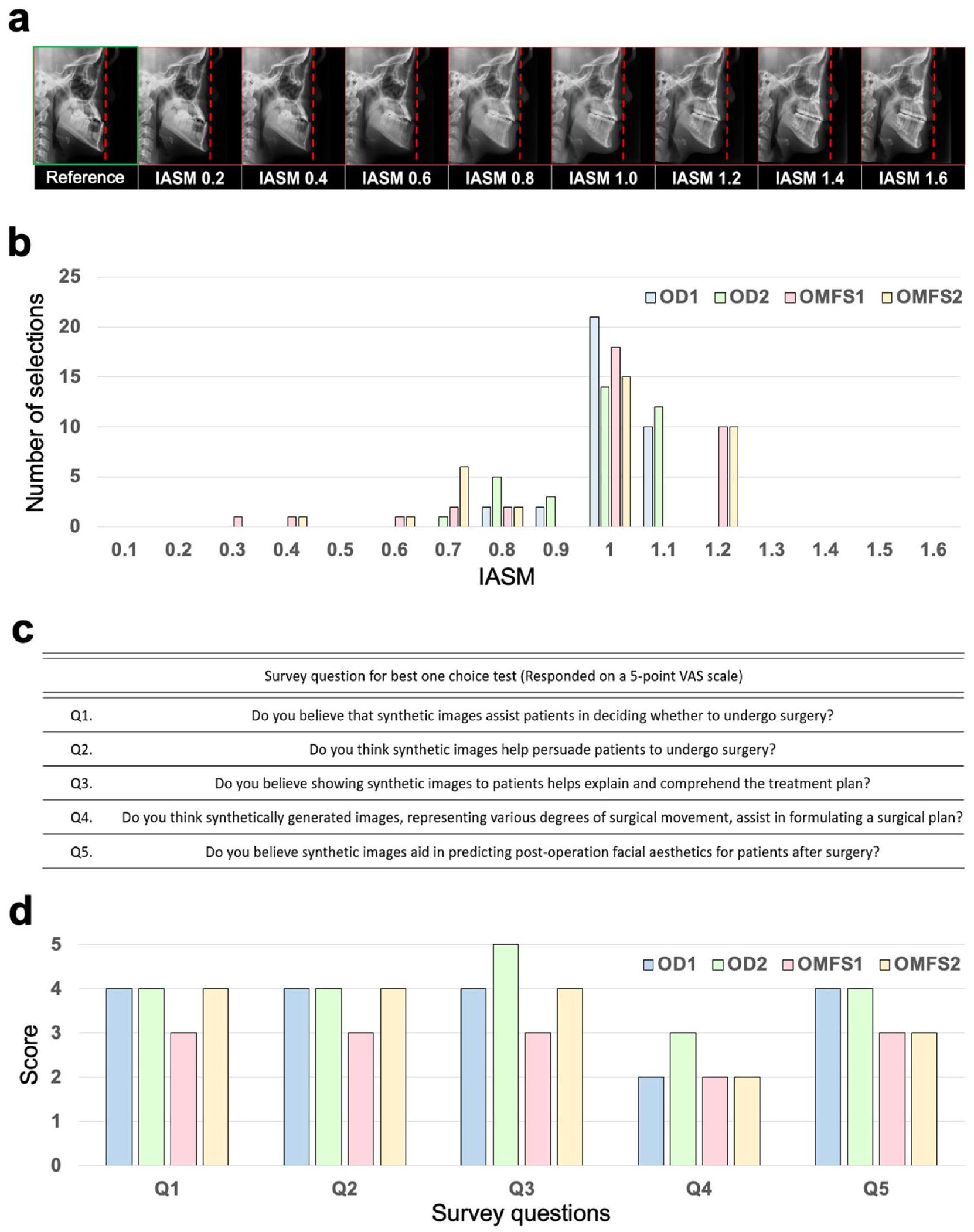 تم إنشاء وتقييم تسلسلات ما بعد الجراحة المعدلة بقيم مختلفة لـ IASM في اختبار لاختيار النتائج الجراحية المناسبة بناءً على ما قبل الجراحة. كانت معظم الإجابات التي اختارها الفاحصون الأربعة في حالة عمياء ضمن المعايير للتوقعات المفضلة.IASM )، مما يعني أنه إذا كان من الممكن تقديم حركة جراحية مناسبة، فإن نموذجنا التوليدي سيكون قادرًا على توليد صور يمكن استخدامها كهدف جراحي محاكى. لذلك، مع نموذجنا المقترح، يمكن التنبؤ بنتائج الجراحة بشكل موثوق واستخدامها في الممارسة السريرية الفعلية. في نفس الاختبار، استجاب معظم أطباء الأسنان وأطباء جراحة الفم والفكين بشكل إيجابي لفائدة الصور بعد العملية. على وجه الخصوص، ستكون الصور بعد العملية مفيدة جدًا في شرح أنواع مختلفة من الخطط الجراحية للمرضى والتنبؤ بنتائج جراحاتهم. ومع ذلك، لم يكن لدى الخبراء توقعات عالية بشأن فائدة الصور بعد العملية في وضع خطة جراحية فعلية. قد يكون ذلك لأن الكميات الفعلية للحركة العظمية لم يكن من الممكن تحديدها ببساطة من الصور بعد العملية. كان من الممكن الحصول على إجابة أكثر إيجابية إذا تم تقديم كميات الحركة العظمية مع مقارنة بين الصور قبل العملية والصور بعد العملية.