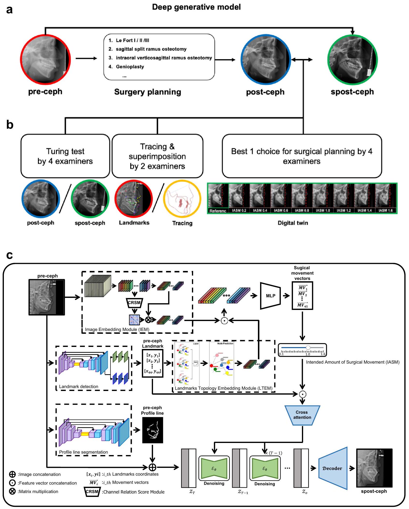 استنادًا إلى IASM وpre-ceph، يتم توليد spost-ceph بواسطة GPOSC-Net. في هذه الدراسة، تتبعت اثنان من أطباء الأسنان spost-cephs وقارناها مع post-cephs لتقييم دقة مواقع المعالم وخطوط ملف الأنسجة الرخوة والصلبة. تم رقمنة 45 معلمًا بواسطة أطباء تقويم أسنان ذوي خبرة باستخدام برنامج V-ceph (الإصدار 8.0، Osstem، سيول، كوريا). بالإضافة إلى ذلك، تم إجراء VTT مع اثنين من أطباء الأسنان واثنين من جراحي الفم والوجه والفكين للتحقق من جودة spost-cephs. خلال عملية توليد spost-ceph، تم إنتاج ومراجعة صور إضافية تعكس كميات مختلفة من الحركة الجراحية لوضع خطة جراحية مناسبة (الشكل 3a، b). يتم تصور نموذج GPOSC-Net المقترح في الشكل 3c.