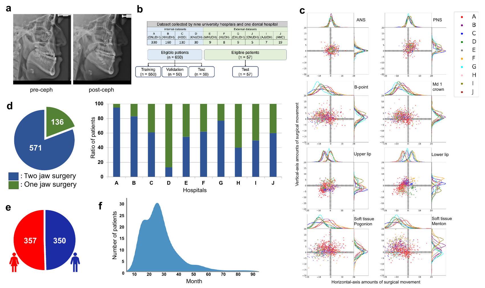 lip, soft tissue pogonion, and soft-tissue menton. d Distribution of surgery types across the entire dataset and proportion of each type per hospital, where the horizontal axis of the bar graph represents the hospitals, and the vertical axis indicates the ratio of patients. Consequently, 57 pairs of pre- and post-cephs from six university hospitals (E, F, G, H, I, and J) were used for external tests. e Gender distribution of patients. Distribution of pre-surgical orthodontic treatment time, where the horizontal axis represents the number of months, and the vertical axis denotes the number of patients.
