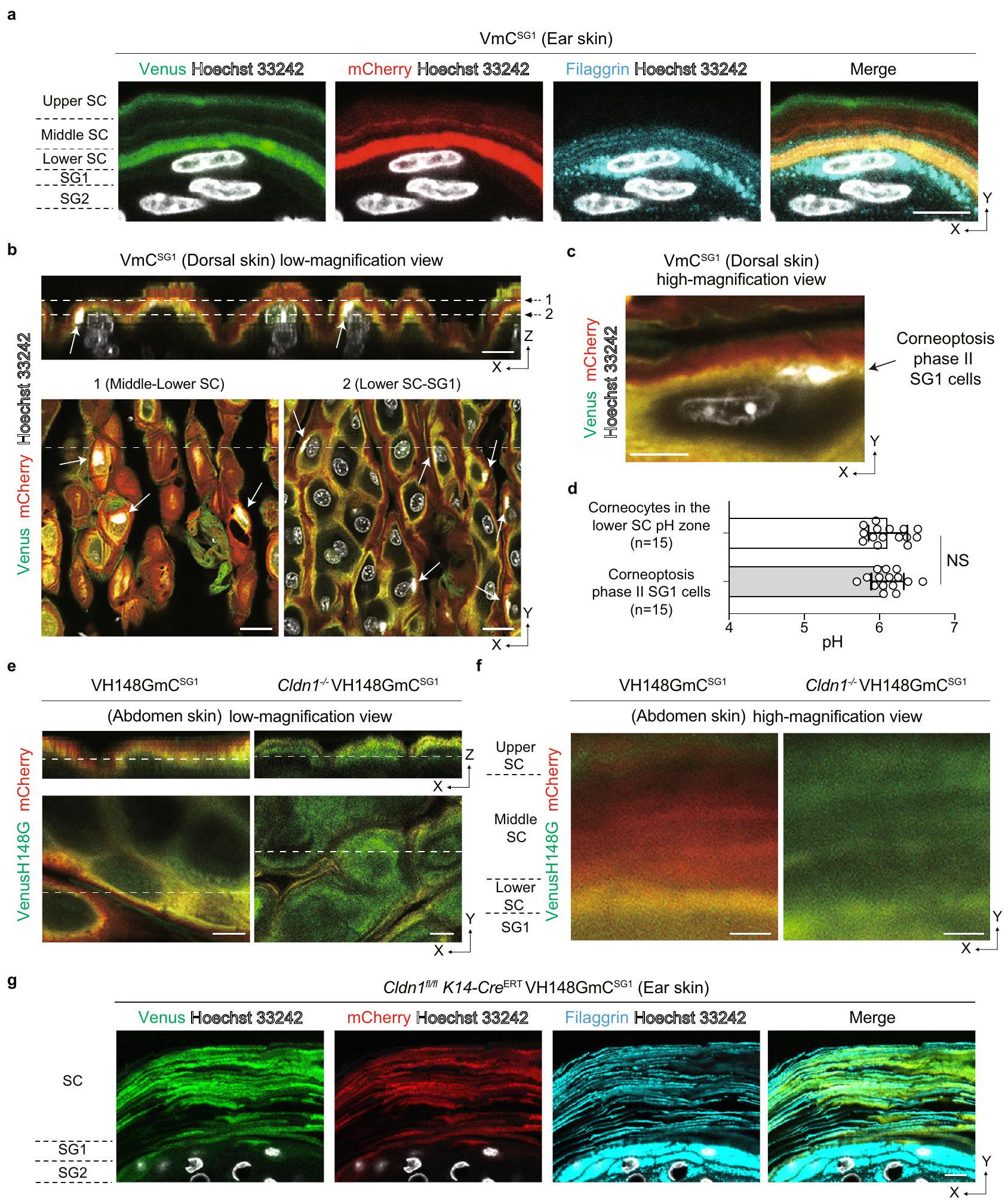 حيث تتشكل الخلايا القرنية من خلال موت خلايا SG1 (الكورنيوبتوزيس) وتصبح خلايا SG1 حمضية خلال المرحلة الثانية من الكورنيوبتوزيس.، ثم هدفنا بعد ذلك إلى تحديد موقع وقيمة الرقم الهيدروجيني لخلايا SG1 في المرحلة الثانية من الكورنيوبتوز. للقيام بذلك، قمنا بحقن Hoechst 33242 في جلد و تمت دراسة الفئران وأُجريت تصوير pH داخل الأنسجة في طبقة الجلد. كانت خلايا SG1 ذات السيتوبلازم الأصفر وصبغة نووية Hoechst 33242 (التي تت correspond إلى المرحلة الثانية من الكورنيوبتوز) موجودة في الطبقة السفلية من منطقة SC-pH السفلية (الشكل 2b و c، والشكل التكميلي 3c، والفيلم التكميلي 3). كان pH خلايا SG1 في المرحلة الثانية من الكورنيوبتوز مشابهًا لذلك الموجود في الكورنيوسيتات في منطقة SC-pH السفلية (الشكل 2d)، مما يشير إلى أن منطقة SC-pH السفلية تنشأ من الحموضة التي تحدث خلال المرحلة الثانية من الكورنيوبتوز.
