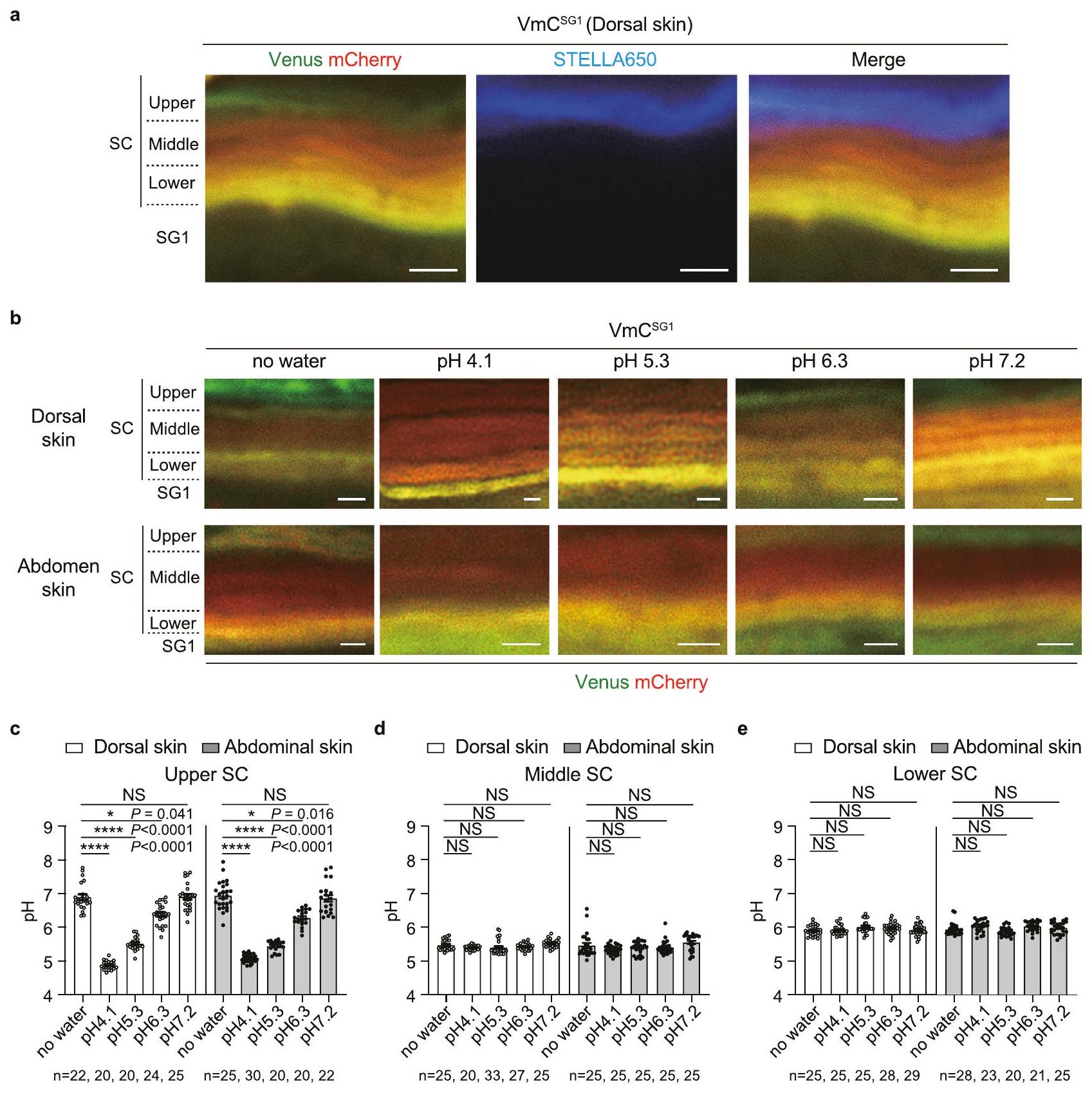 نظرًا لأن منطقة SC-pH المتوسطة الحموضة تتمايز أكثر إلى منطقة SC-pH العليا شبه المحايدة، قمنا بدراسة تأثير المحفزات الخارجية على تمايز مناطق pH. استخدمنا صبغة STELLA Fluor 650 (صبغة فلورية تتميز بثبات شدة فلوروسنتها عند; مذاب في محلول ملحي معزز بالفوسفات) يحتوي على ماء ميلي-كيو على سطح الجلد الظهري لـالفئران. تم ملاحظة إشارات STELLA Fluor 650 فقط في الطبقة العليا من SC، والتي تت correspond إلى منطقة SCpH العليا (الشكل 3a). كانت هذه النتيجة متسقة مع الملاحظات السابقة المستندة إلى مطيافية الكتلة للأيونات الثانوية بتقنية زمن الطيران (TOF-SIMS)، والتي اقترحت وجود منطقة سطحية سمحت بوجود أيونات سلبية (أي، البوتاسيومالتدفق والدفق. علاوة على ذلك، قمنا بتطبيق محاليل عازلة بقيم pH مختلفة ( ) إلى جلد الظهر والبطن من الفئران وقاسوا درجة الحموضة لكل منهاالمنطقة و SG1. في كل من الجلد الظهري والبطني، تغير الرقم الهيدروجيني في المنطقة العليا من SC-pH بشكل ملحوظ بعد معالجة العازل. بالمقابل، قدمت المناطق الوسطى والسفلى من SC-pH قيم pH مشابهة لتلك الموجودة في الفئران غير المعالجة (الشكل 3b، c). لذلك، تظهر المنطقة العليا من SC-pH خصائص مشابهة للتكيف ويمكنها تعديل الرقم الهيدروجيني الخاص بها وفقًا للتغيرات في الرقم الهيدروجيني الخارجي، على عكس المناطق السفلى والوسطى من SC-pH.