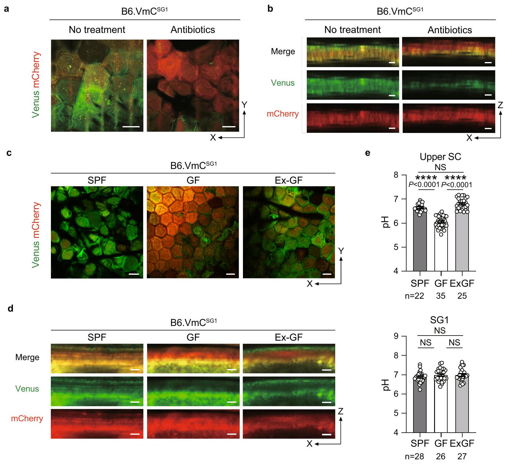 نظرًا لأن ميكروبات الجلد تعيش على سطح الطبقة القرنية، قمنا بتقييم ما إذا كانت وجودها ضرورية للحفاظ على درجة حموضة الطبقة العليامنطقة. لقد عالجنافئران خالية من مسببات الأمراض المحددة (SPF) مع خليط من الأجسام المضادة تم الإبلاغ عنه سابقًا لتقليل عبء ميكروبيوم الجلد وأجرينا تصوير SC-pH داخل الكائن الحي (الشكل 4 أ، ب، والفيلم التكميلي 4). وجدنا أن معظم منطقة SC-pH العلوية من الفئران التي تلقت المضادات الحيوية أصبحت حمضية، وانخفضت منطقة pH العلوي المحايد بشكل كبير، مما يشير إلى أن ميكروبيوتا الجلد يمكن أن تعادل pH منطقة SC-pH العلوية. لتأكيد ذلك، قمنا بإنشاءخالي من الجراثيم ( الفئران وأجرينا تصوير pH داخل الجسم باستخدام SC (الشكل 4c و d، والفيلم التكميلي 4). اكتشفنا أن درجة حموضة الجزء العلويمنطقةكانت مستويات الفئران (pH 6.05 [95% CI 5.97-6.13]) أقل بشكل ملحوظ من تلك الخاصة بسلالة B6.فئران SPF (pH 6.65 [95% CI 6.58-6.72]). ومع ذلك، B6.