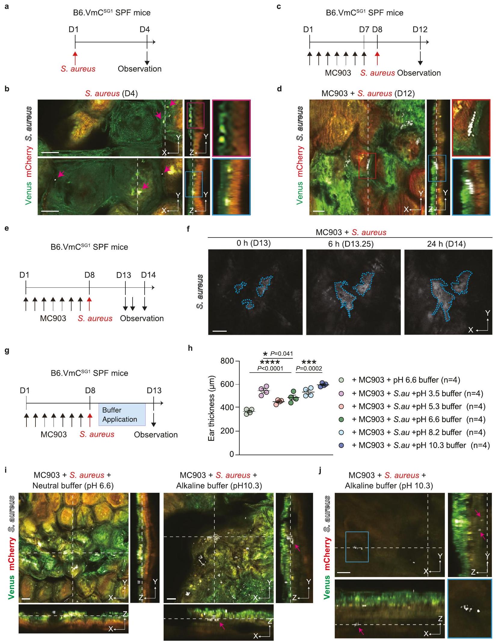 نظرًا لأن منطقة SC-pH المتوسطة الحمضية لم تظهر أي إشارات لـ S. aureus، قمنا بعد ذلك بفحص تأثير الحموضة في منطقة SCpH المتوسطة. بعد أن طبقنا MC903 على آذان B6.VmCتم تطبيق بكتيريا S. aureus المعلمة بـ VFP على الفئران لمدة 7 أيام (الأيام 1-7) في اليوم الثامن، وتم استخدام محاليل ذات pH مختلف مرة واحدة يوميًا في الأيام (أربعة أيام) إلى الأذنين، وتم تحليلها في اليوم 13 (الشكل 5 ج). B6.VmCأظهرت الفئران التي تلقت محلولاً بتركيز pH 10.3 التهاباً جلدياً معززاً، مما أدى إلى ظهور جلد الأذن أكثر سمكاً بشكل ملحوظ مقارنة بالفئران التي تلقت محلول pH 6.6 (الشكل 5h). كشفت التصوير الحي لـ S. aureus وتوزيع SC-pH أنه بينما في الفئران التي تلقت محلول pH 6.6تم استعمار S. aureus أفقيًا في أسفل منطقة SC-pH العلوية تقريبًا المحايدة، حيث قامت تطبيقات محلول pH 10.3 بتحييد المناطق الوسطى من SC-pH، مما مكن S. aureus من الدخول إلى المناطق الوسطى أو السفلية من SC-pH (الشكل 5i) وحتى إلى SG (طبقة الخلايا الحية) (الشكل 5j والشكل التكميلية 4h والفيلم التكميلية 6). وبالتالي، تشير هذه النتائج إلى أن منطقة SC-pH الحمضية الوسطى هي طبقة الحماية الحمضية التي تعمل كحاجز واقي ضد S. aureus.