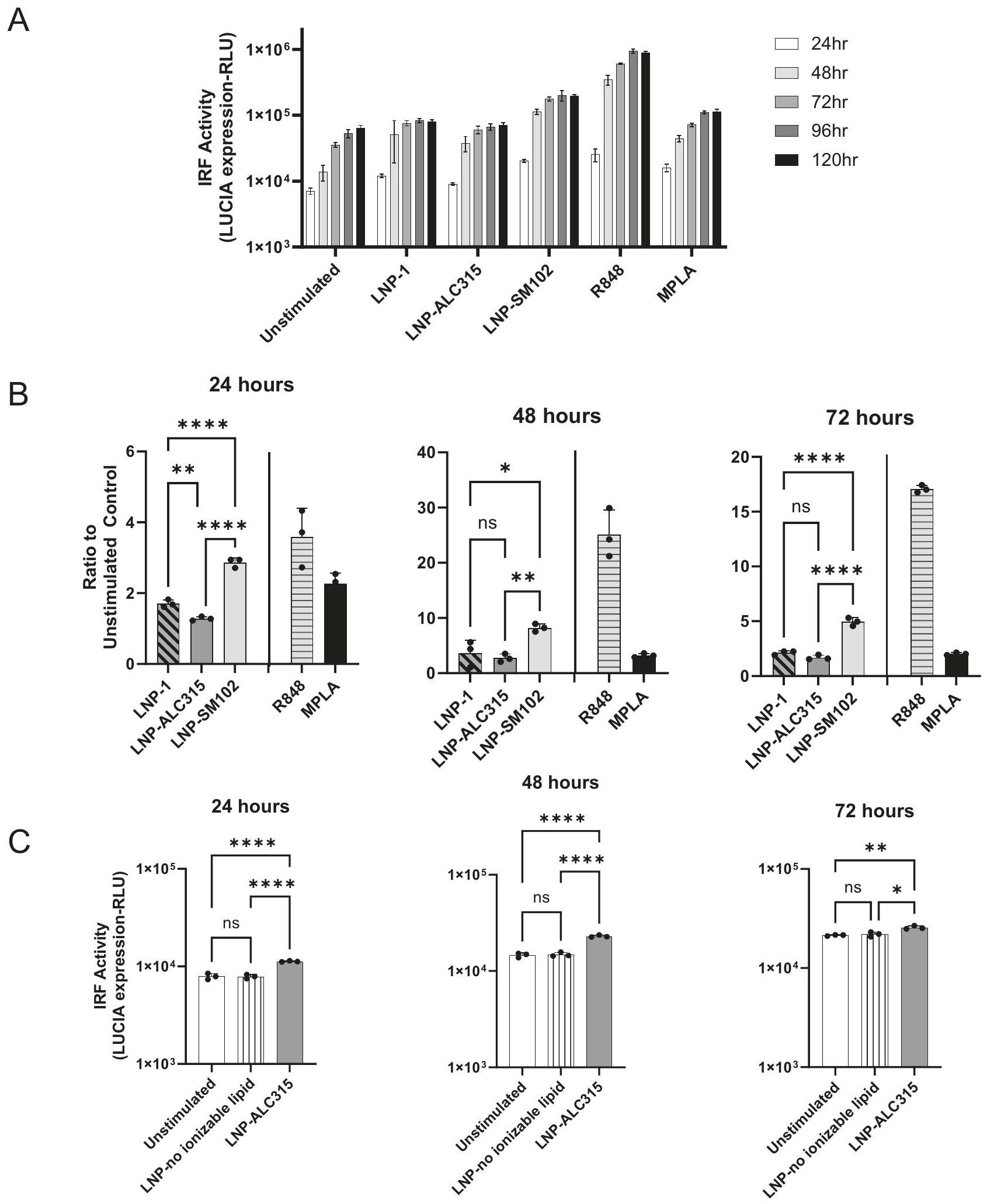 We also investigated the activation of IRF pathways in response to the ionizable LNPs. We measured a 3 and 1.7 -fold increase at 48 and 72 h , respectively, in the IRF reporter in response to LNP-ALC315 in comparison to the control (Fig. 2A, B). Unlike with NF- , LNP-1 had a similar IRF response to LNP-ALC315 while LNP-SM102 elicited a significantly greater response (Fig. 2A, B). The TLR agonist R848 exhibited the highest increase in IRF response, which was significantly higher than the empty LNPs and TLR agonist MPLA (Supplementary Fig. 3B). We also observed a dose dependent IRF response to each LNP that plateaued at (Supplementary Fig. 2B). Additionally, we assessed the ionizable lipid’s contribution and showed that an LNP lacking ionizable lipid was unable to elicit IRF activation (Fig. 2C). This indicates that the IRF response, like NF- , is primarily driven by the ionizable lipid component.