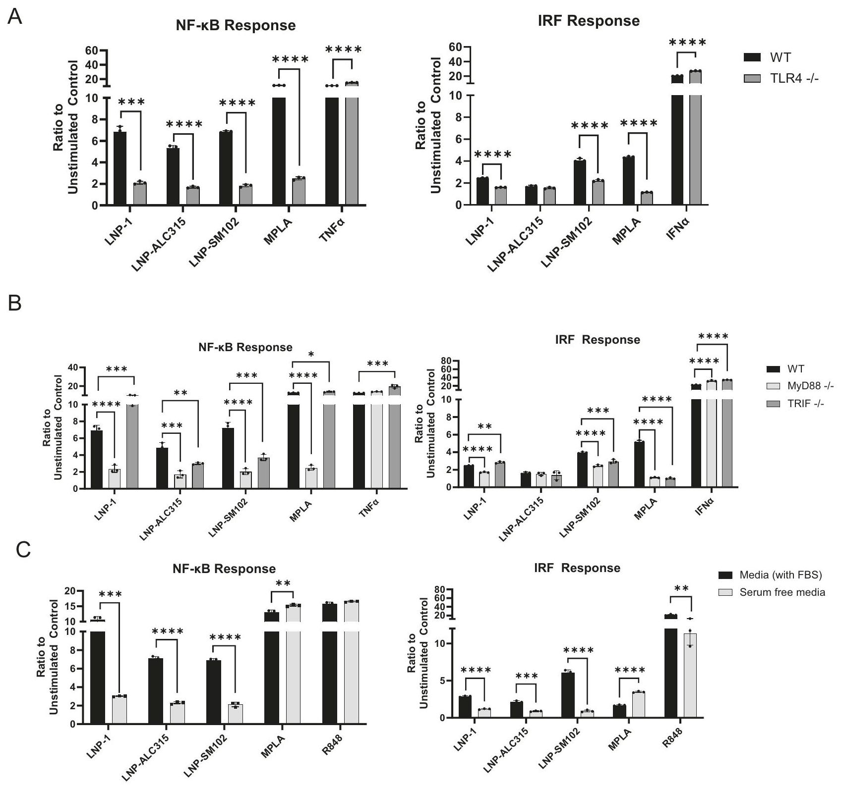 التنشيط بواسطة جميع LNPs القابلة للتأين في خلايا THP-1 التي تفتقر إلى MyD88 بعد 72 ساعة (الشكل 4B) (الشكل التوضيحي 8B). في المقابل، أظهرت خلايا THP-1 التي تفتقر إلى TRIF زيادة طفيفة في تنشيط NF- بواسطة LNP-1. ومع ذلك، أثارت LNPALC315 و LNP-SM102 استجابة مخفضة في TRIF-KO، على الرغم من أنها ليست بنفس الدرجة كما في MyD88-KO (الشكل 4B) (الشكل التوضيحي 8B). تم رؤية نتائج مماثلة مع استجابة IRF في TRIF-KO. توضح هذه النتائج أنه على الرغم من أن جميع LNPs الثلاثة يتم التعرف عليها بواسطة TLR4، إلا أن لديها اعتمادًا متنوعًا على بروتينات التكيف على الرغم من أن الإشارات كانت بشكل أساسي عبر مسار TLR4/MyD88.