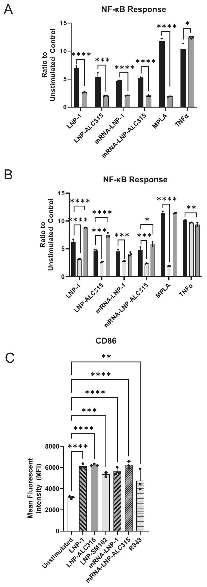Responses varied across LNPs. LNP-SM102 (mRNA-1273 formulation) elicited the greatest IRF response, LNP-1 the strongest NF- response, and LNP-ALC315 (BNT162b2 formulation) showed similar NF activation to LNP-SM102 and IRF activation similar to LNP-1. No response was observed without the ionizable lipid component, confirming its role as the driver of NF- and IRF activation. Although we did not test this with LNP-SM102, the ionizable lipid is likely the driver but we cannot rule out a role for its pegylated lipid. We posit that structural differences may influence strength of NF- and IRF activation, as seen with LPS variations across bacterial species in TLR4 signaling . Thus, ionizable lipid design is a potential manner in which LNPs can be modified to enhance adjuvanticity or diminish reactogenicity.