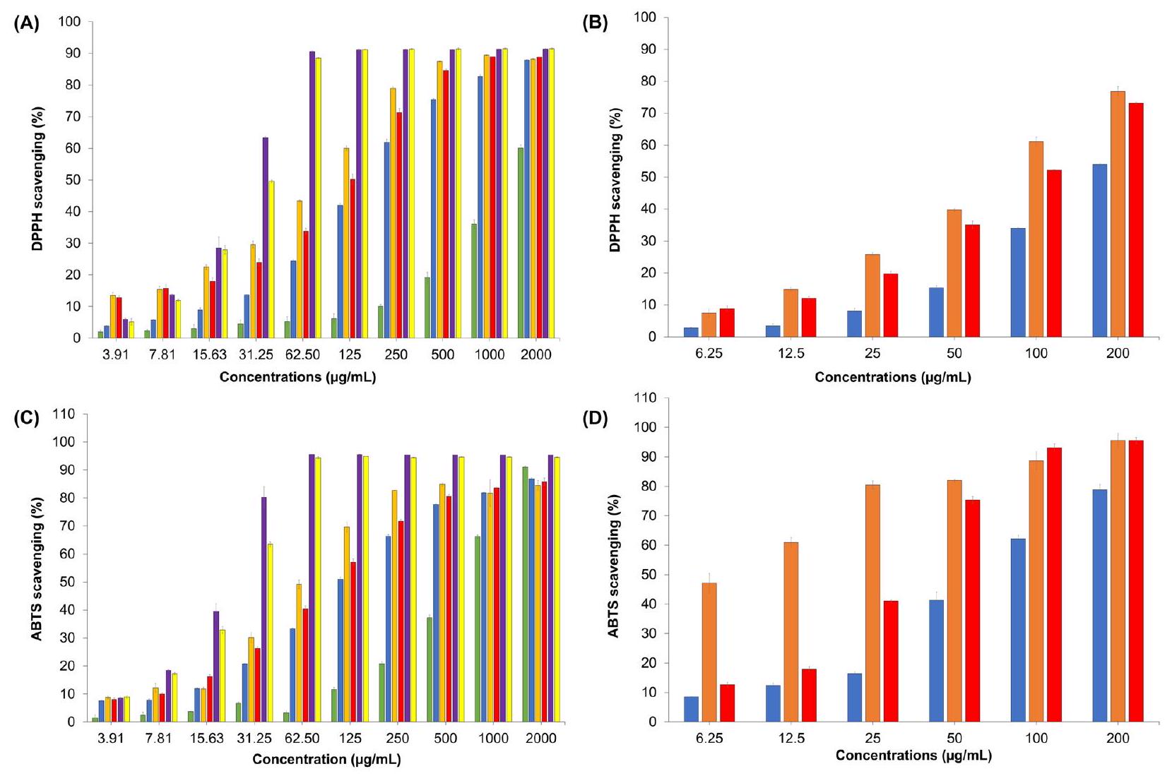 conducted through the utilization of the 1,1-diphenyl-2-picrylhydrazyl (DPPH) assay, as represented in Fig. 1. The results obtained from the evaluation of radical scavenging capacity employing the 2,2′-azino-bis(3-ethylben-zothiazoline-6-sulfonic acid) diammonium salt (ABTS+)