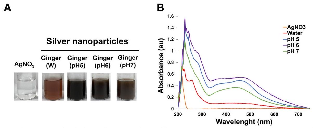 توضح الشكل 2B أن طول موجة مستخلص الزنجبيل يصل إلى أقصى قيمة له عند 457 نانومتر عندما يتم تحضير pH لمستخلص الزنجبيل إلى 6. تظهر قيم الامتصاص تحولات طفيفة في pH أخرى، مما يشير إلى تغييرات في حجم الجسيمات [53]. علاوة على ذلك، تؤكد النتائج التجريبية أن امتصاص الضوء في نطاق الطول الموجي من 400 إلى 500 نانومتر يكون أكثر وضوحًا عند pH 6. يمكن أن يُعزى هذا الظاهرة إلى التركيز المرتفع من المكونات الفينولية [54] والفلافونويدات الموجودة في مستخلص الزنجبيل عند pH 6. نتيجة لذلك، يتم تحضير مستخلصات الزنجبيل باستخدام الإيثانول والإيثيل.