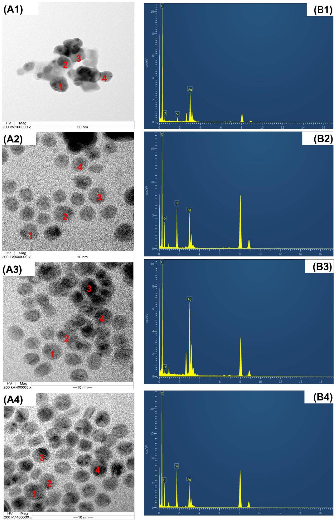 تم استخراجها في كل من أنظمة الماء والمذيب المساعد. كشفت فحوصات TEM أن جزيئات الفضة النانوية المنتجة في هذه الظروف أظهرت شكلًا كرويًا بشكل أساسي. تم تحديد الحجم المتوسط لجزيئات الفضة النانوية ليكون بين 28 و 105 نانومتر، كما يتضح من صور TEM (الشكل 4A).