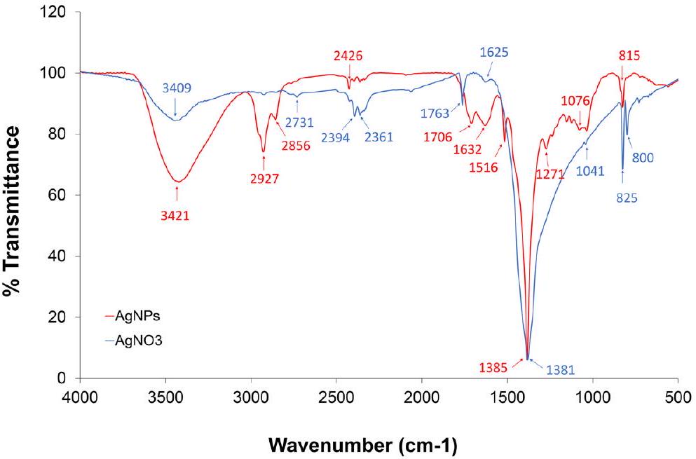 تم إجراء (FTIR) على المسحوق المجفف بالتجميد المستمد من محلول AgNP. تم إجراء التحليل باستخدام جهاز Bruker Tensor 27، مع استخدام كريات KBr كوسيلة عينة، وشمل نطاق الطول الموجي من 400 إلى