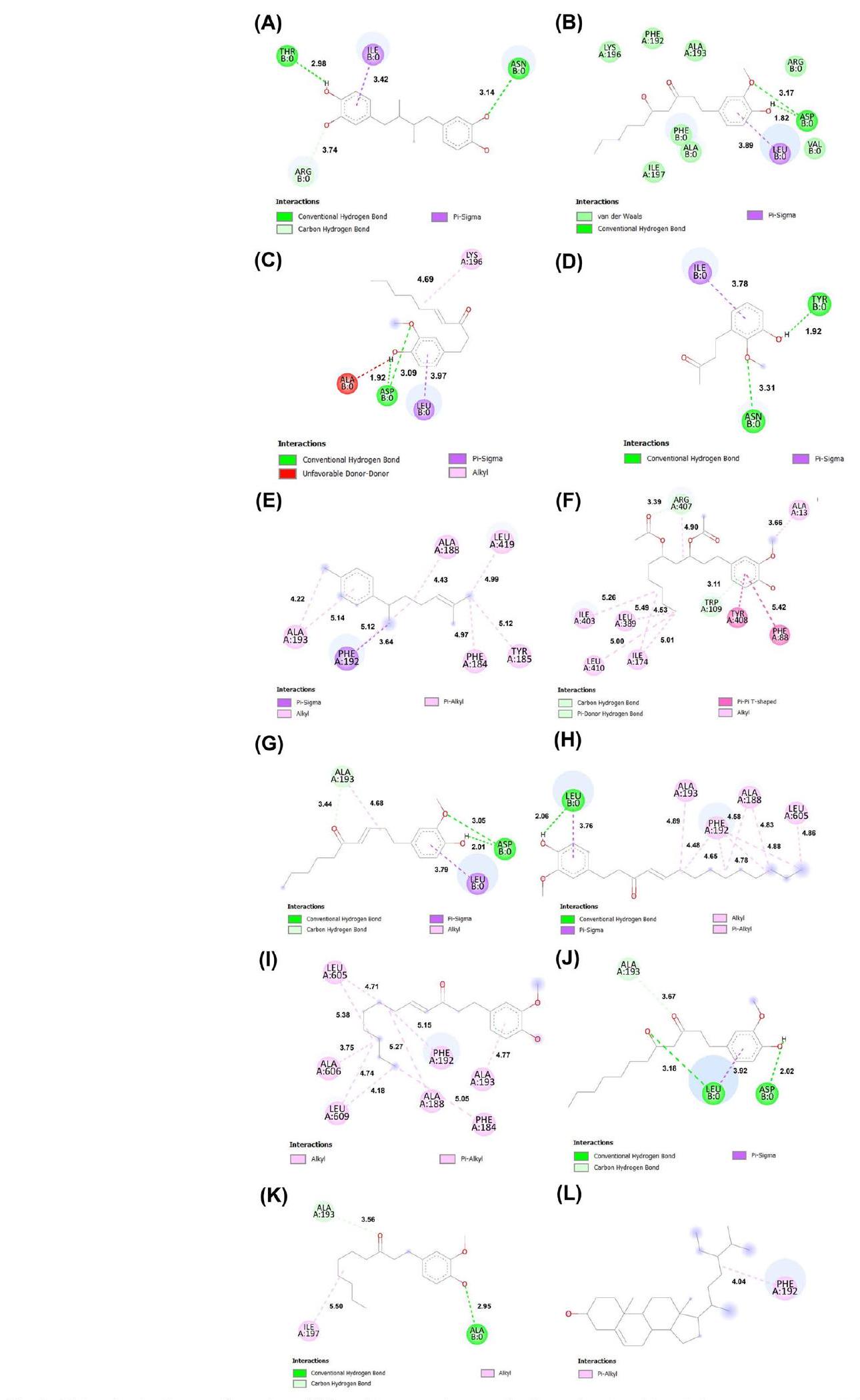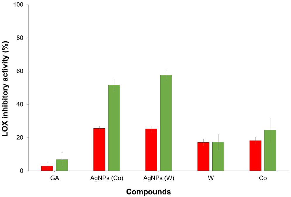 inflammatory ailments. These bioactive compounds exert their therapeutic actions primarily by inhibiting the production of prostaglandins via the cyclooxygenase (COX) and lipoxygenase (LOX) pathways [20]. The historical utilization of ginger infusions for the management of conditions such as rheumatism and arthritis has prompted extensive research into the anti-inflammatory mechanisms of the plant’s secondary metabolites. According to several researchers [21,22], the anti-inflammatory properties of 6-gingerol can be attributed to its capacity to diminish pro-inflammatory cytokine levels and impede antigen presentation by macrophages stimulated by lipopolysaccharides (LPS). Liang et al. [23] conducted a study demonstrating that shogaols and all gingerols exhibit a dose-dependent reduction in the production of nitric oxide (NO) in RAW 264.7 cells treated with LPS. Thus, the integration of ginger extract as a reducing agent in the synthesis of AgNPs serves a dual purpose of enhancing anti-inflammatory action and minimizing the overall material requirements for anti-inflammatory product development. Notwithstanding the feasibility of utilizing ginger for AgNPs synthesis, investigations exploring ginger extracts with elevated concentrations of phenolic and flavonoid constituents are currently lacking. This research gap arises from the recognition that the extraction of biologically active chemical constituents from the phenolic and flavonoid classes is of paramount importance in attaining exceptional properties as reducing agents [24]. Furthermore, the active compounds present in ginger, which exhibit significant phenolic and flavonoid content, hold promise for enhancing the inhibition of inflammation [25]. The utilization of computerbased studies can play a pivotal role in reducing errors inherent in experimental procedures and increasing the likelihood of successful outcomes, thereby circumventing the need for extensive trial and error. Consequently, an investigation into the efficacy of ginger’s main compounds in inhibiting inflammatory production, achieved through the use of molecular docking processes to impede the activity of the LOX enzyme, contributes to a deeper understanding of the effectiveness of ginger.