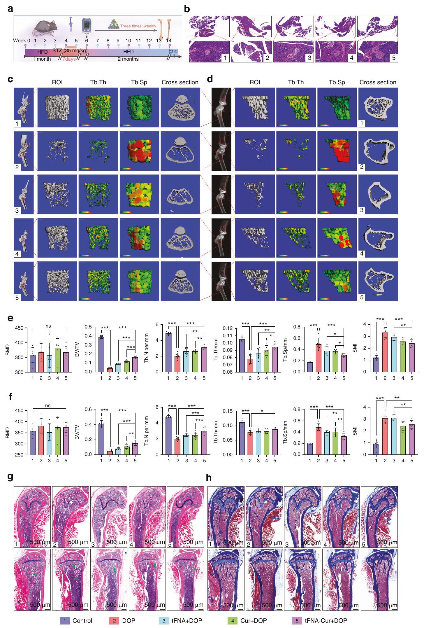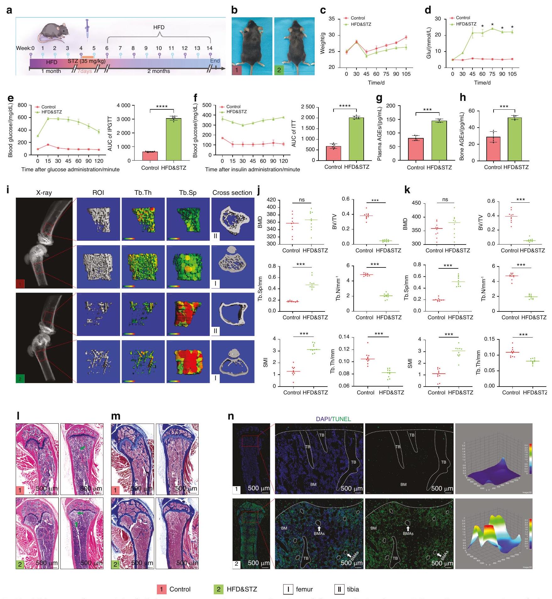 قمنا بإنشاء نموذج للداء السكري من النوع الثاني باستخدام نظام غذائي عالي الدهون (HFD) وجرعة منخفضة من ستربتوزوتوسين (STZ) (الشكل 2أ). تم إجراء تقديرات أسبوعية لوزن الجسم ومستويات الجلوكوز في البلازما، وتم إجراء اختبار تحمل الجلوكوز داخل الصفاق (IPGTT) واختبار تحمل الأنسولين (ITT) في يوم القتل الرحيم. استمرت مستويات الجلوكوز في البلازما في الفئران المعالجة بـ HFD&STZ في الارتفاع، بينما انخفضت أوزانها (الشكل 2ب-د). أظهر IPGTT وITT ضعف تحمل الجلوكوز ومقاومة الأنسولين في الفئران المعالجة بـ HFD&STZ (الشكل 2هـ، و). كما دعمت مقاطع البنكرياس هذه النتيجة (الشكل S3). من المثير للاهتمام، أننا وجدنا أن مستويات المنتجات النهائية المتقدمة للجليكوزيل (AGEs) في البلازما والعظام لدى الفئران المعالجة بـ HFD&STZ قد زادت أيضًا (الشكل 2ز، ح). تُعرف AGEs بأنها علامات على مرض السكري، وتراكمها يؤدي إلى مضاعفات مختلفة.