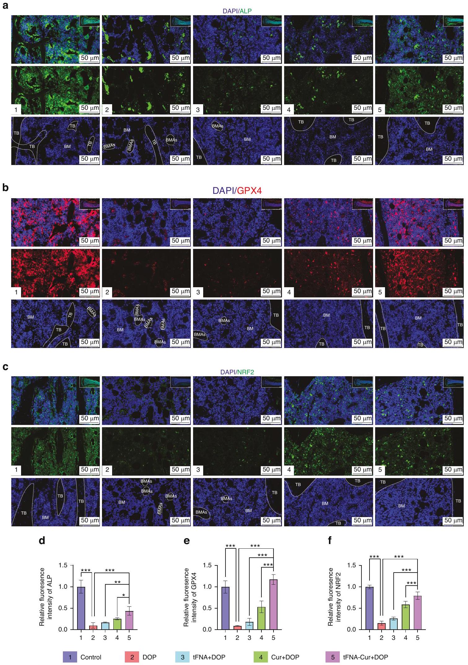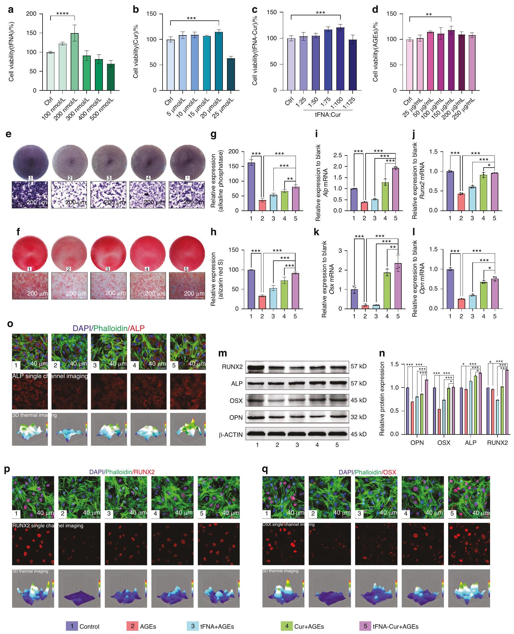 تم تثبيطها بشكل كبير في مجموعة العلاج ولكن تم عكسها بواسطة معالجة tFNA-Cur (الشكل 3i-I). تم دعم هذه النتائج بشكل أكبر من خلال تحليلات مستوى البروتين (الشكل 3m-q، الشكل S7a-c). ALP (علامة للخلايا العظمية)، OSX (علامة محددة لخلايا سلف الخلايا العظمية) وRUNX2 (علامة للخلايا العظمية الناضجة)