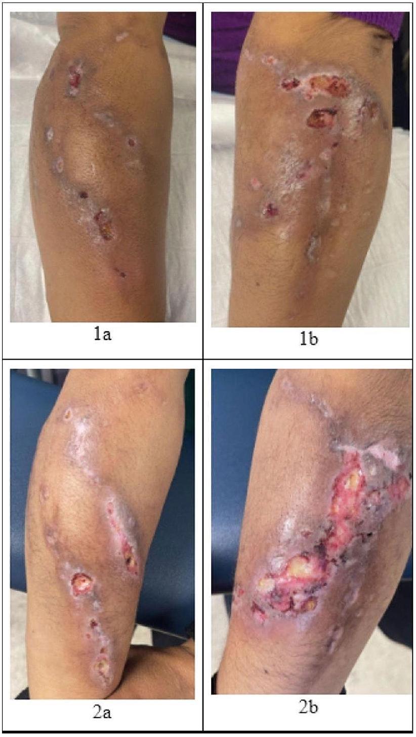 She presented to a free student-run clinic at the IDEA Miami syringe services program (SSP) for wound care [14]. During that time, she was injecting 0.25 g of fentanyl and cocaine together per day in her hands and arms. At this visit, she reported ulcers on bilateral upper extremities. She stated that she had never had wounds like these before despite injecting drugs for 6 years. She described the wounds starting as closed areas of hypopigmentation, then gradually opening, and producing foul-smelling yellow drainage. She noted that when the wounds began, she had a fever that subsided after one day. She had no night sweats, chills, or lymphadenopathy. On a physical exam, she had multiple ulcerations, with the largest being 4 cm in diameter, diffusely over her bilateral forearms with surrounding erythema and warmth (see Fig. 1: 1a, 1b). She did not have wounds present on her legs at this time. A diagnosis of xylazineassociated skin ulcers was favored over other infectious or inflammatory skin conditions due to the clinical picture and recent studies reporting similar case presentations in cities with large populations of PWUD. The wounds were cleaned with saline and dressed with petro-leum-impregnated gauze. The patient was instructed to clean the wounds with water and soap daily and replace the petroleum- impregnated gauze dressing. She was also prescribed a course of doxycycline for suspected superimposed bacterial infection.