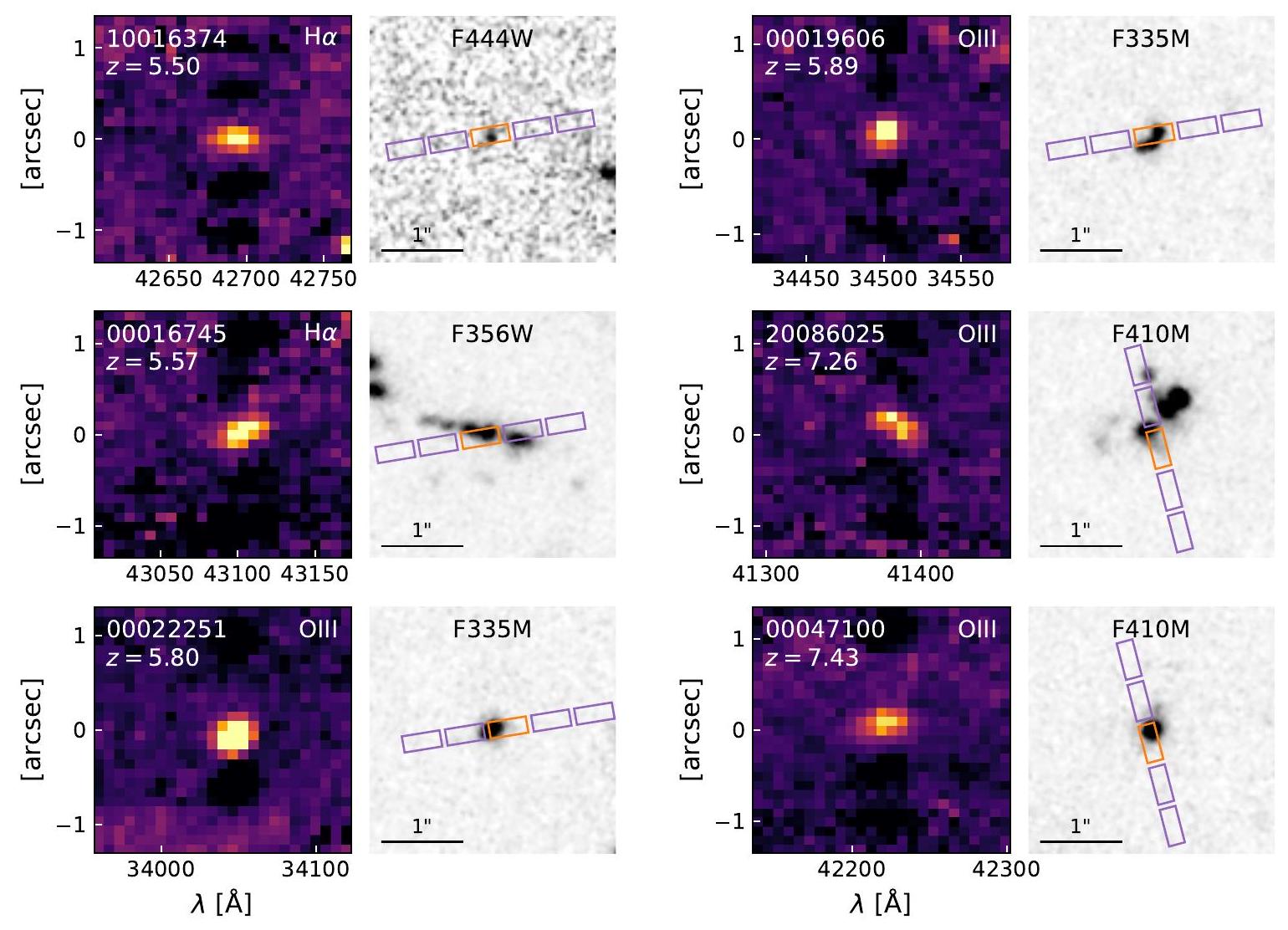 الشكل 1. عينة من ستة أجسام عالية الانزياح الأحمر ذات دقة مكانية في JADES. تظهر الألواح اليسرى قصاصات من خطوط الانبعاث في الأطياف المجمعة والمست rectified ثنائية الأبعاد التي تم الحصول عليها باستخدام شبكة G395H عالية الدقة. السلبيات في القصاصات هي نتيجة لطريقة طرح الخلفية. تظهر الألواح اليمنى قصاصات صورة NIRCam لكل جسم (JADES و FRESCO) للنطاق الذي يشبه أكثر شكل خط الانبعاث (القسم 2.2). تؤدي الشقوق الثلاثة للغالق ونمط التلويح ثلاثي النقاط الذي استخدمناه إلى منطقة فعالة من خمسة غالق: الغالق الذي يحيط بالمصدر يظهر باللون البرتقالي، والغالق المستخدم لطرح الخلفية يظهر باللون الأرجواني.
