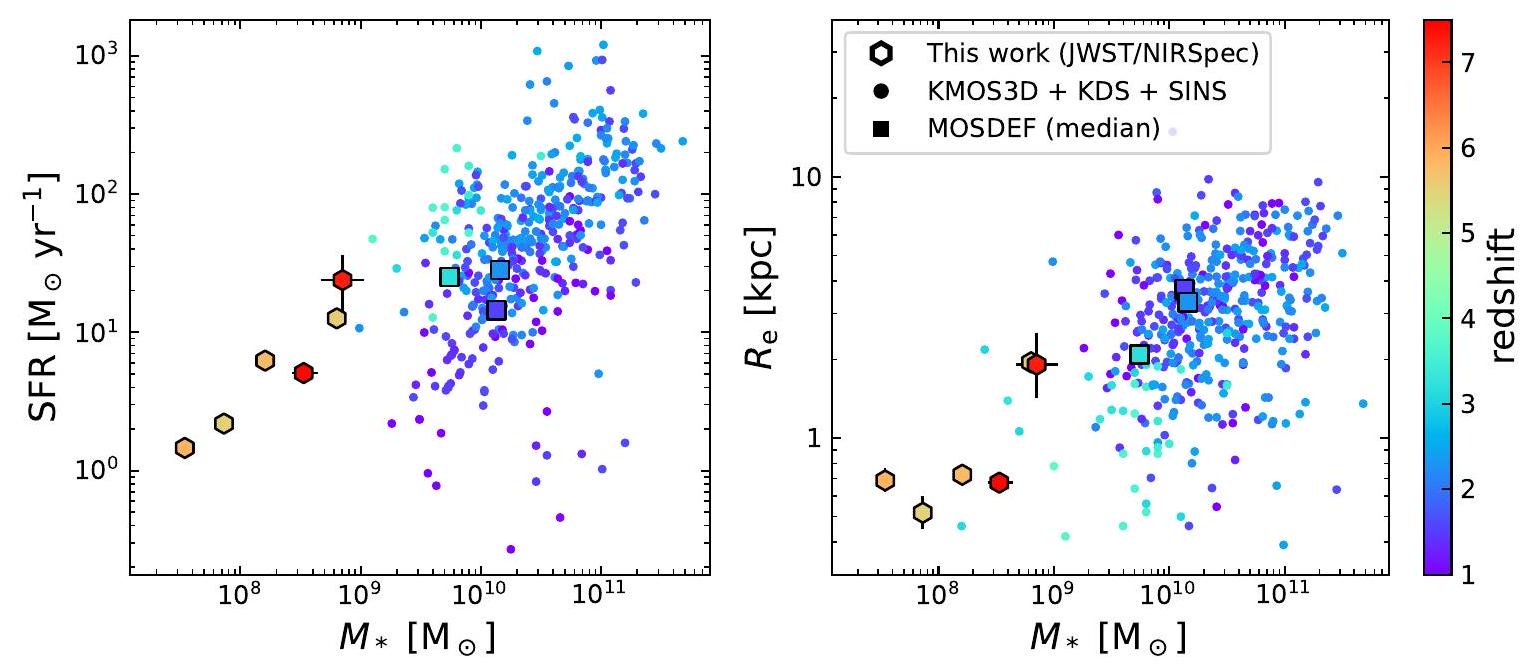 الشكل 2. توزيع عينة في فضاء المعلمات لكتلة النجوم، SFR، ونصف قطر خط الانبعاث، مشفر بالألوان حسب الانزياح الأحمر. نقارن هذا مع مجموعة من المسوحات الطيفية القريبة من الأشعة تحت الحمراء التي أجريت على الأرض والتي استخدمت خطوط و [OIII] لقياس الحركيات المجرة عند (Turner et al. 2017; Förster Schreiber et al. 2018; Wisnioski et al. 2019; Price et al. 2020). استخدمنا SFRs من UV+IR من Whitaker et al. (2014) حيثما كان ذلك متاحًا لعينة Turner et al. (2017). نلاحظ أن جميع الأجسام عند من KMOS3D تظهر في هذه الصورة، لكن لم يتم استخدام جميع الأجسام في الدراسات الحركية لأن نسبة الإشارة إلى الضوضاء كانت منخفضة أو كانت الأجسام صغيرة جدًا. العينة المختارة من JADES (السداسيات) تستكشف نظامًا مختلفًا تمامًا: تستهدف JADES في انزياح أحمر أعلى وكتلة نجمية أقل مما تم استكشافه حتى الآن بواسطة المرافق الأرضية.