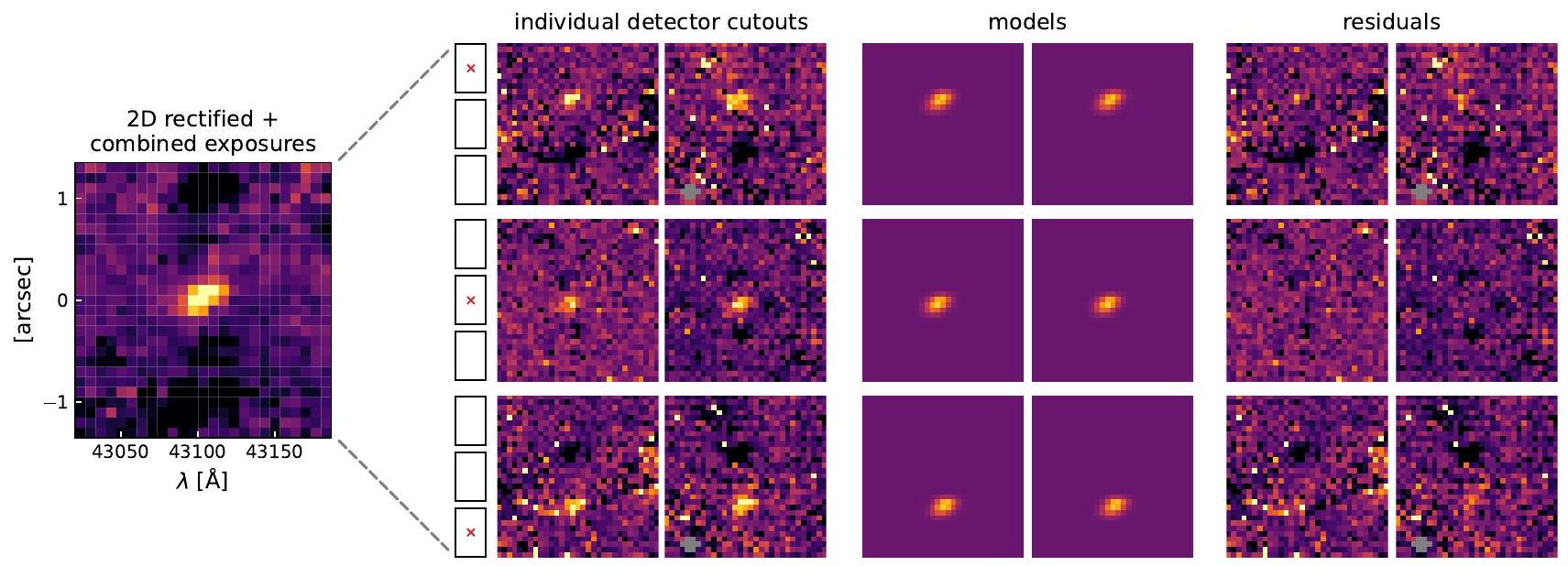 الشكل 3. مثال على إجراء الملاءمة لكائن JADES-NS-00016745 (الشكل 1). على الرغم من أن التركيبة النهائية لجميع التعرضات (يسار) تم استخدامها لفحصنا البصري الأولي واختيار العينة، فإن البكسلات في هذا الطيف مرتبطة بشدة. بدلاً من استخدام هذا الطيف المدمج، قمنا بملاءمة جميع التعرضات الفردية التي تم الحصول عليها في وقت واحد. في حالة JADES-NS-00016745، تم أخذ تعرضين لكل موضع تمايل، مما أدى إلى ستة قياسات مستقلة لنمط تمايل ثلاثي النقاط مع NIRSpec. لأخذ في الاعتبار PSF غير المأخوذ بعين الاعتبار لـ NIRSpec، قمنا بنمذجة في مستوى الكاشف، ناشرين النماذج البارامترية إلى نفس الموقع بالضبط على الكاشف كما هو الحال مع البيانات الملاحظة. ثم يتم حساب الاحتمالية من تركيبة جميع الصور المتبقية. يتم حجب البكسلات التي تم الإشارة إليها من خلال خط أنابيب التخفيض على أنها متأثرة بأشعة كونية وتظهر باللون الرمادي.التدفق المرصود، التدفق النموذجي، وعدم اليقين في البكسل