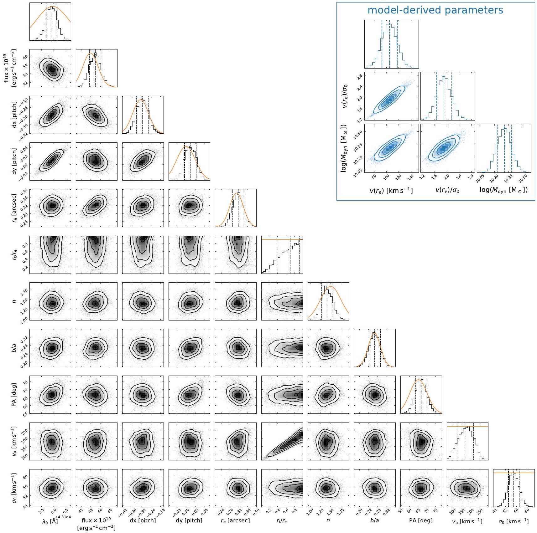 Fig. 4. Corner plot for the 11 -parameter thin-disc model for the object in Fig. 3. Histograms show the posterior probability distributions. The orange lines indicate the prior probability distributions. We generally find good constraints on the kinematic parameters and , although the turnover radius is poorly constrained and degenerate with the rotational velocity. The top right panels show (in blue) the parameters that we derived from the model and are discussed in Sect. 4.