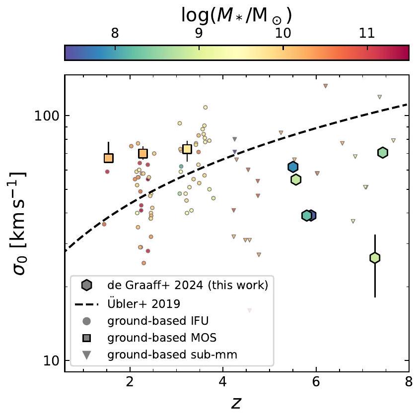 Figure 5 shows the velocity dispersions of our sample as a function of redshift. We compared this with a selection of ground-based near-infrared studies: the MOS results of Price et al. (2020, the medians of their resolved and aligned sample), the IFU samples of Turner et al. (2017) and Förster Schreiber et al. (2018), and the analytical fit to the large IFU survey KMOS3D at from Übler et al. (2019).