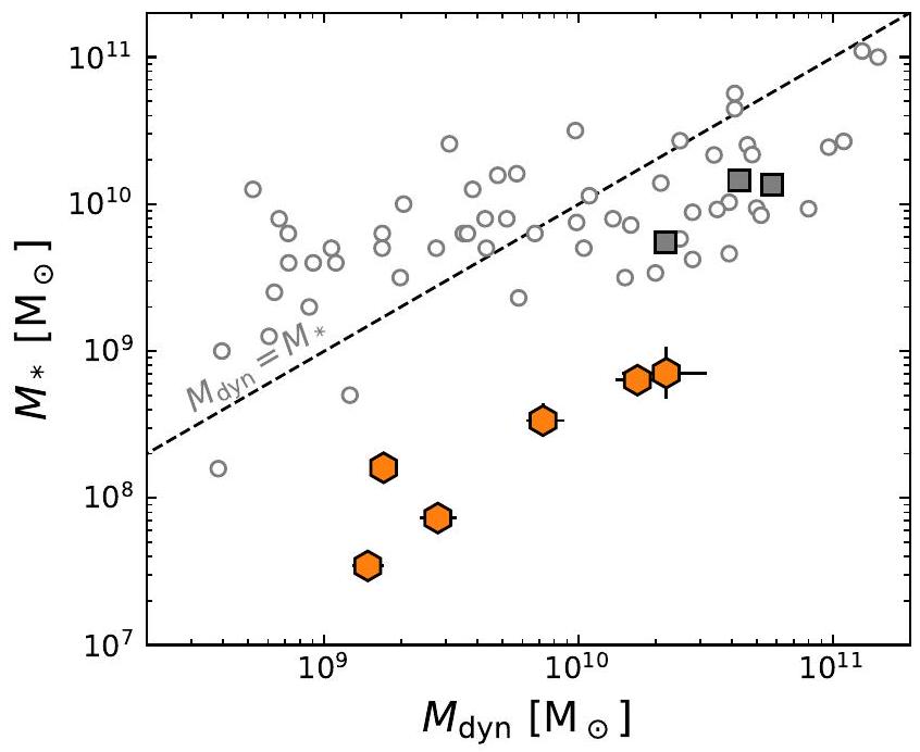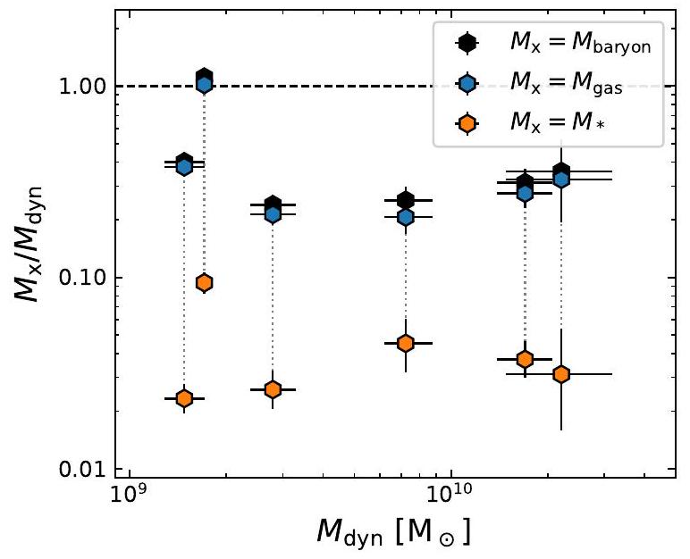 The comparison between the dynamical and stellar masses revealed a surprising discrepancy of a factor of 10-40. After accounting for the high gas masses, the dynamical masses still remain higher than the baryonic masses by a factor of .