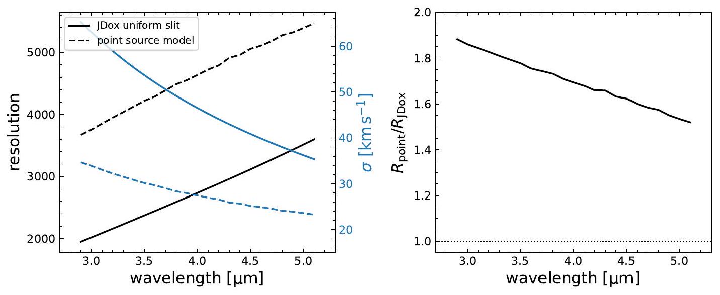 Fig. A.1. Resolution and line spread function (LSF) of the NIRSpec dispersers depend strongly on the light profile of the source. Left: Resolution and corresponding velocity dispersion estimated using our modelling software for a point source in the centre of the shutter and G395H grating (dashed lines). The solid lines show the dispersion curves available on the JWST user documentation webpage (JDox), which provides a (prelaunch) approximation for the LSF of a uniformly illuminated shutter. Right: Ratio of the resolution for a point source and LSF approximation for a uniform light distribution. At shorter wavelengths, the spectral resolution is higher by nearly a factor of 2 for a point source.