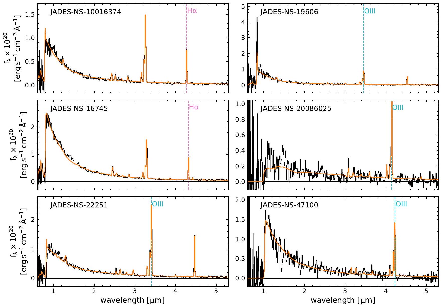 قمنا بفحص بصري لجميع (358) أهداف JADES في GOODS-S التي تتوفر لها طيف NIRSpec عالي الدقة حتى الآن. اخترنا الأجسام التي تقع عند انزياح أحمر مرتفع ( ، أي عندما كان عمر الكون أقل من 1 مليار سنة)، وتمتد مكانيًا في تصوير NIRCam ( )، ولها خطوط انبعاث ساطعة، أي نسبة إشارة إلى ضوضاء متكاملة . بالإضافة إلى ذلك، طلبنا أن لا يظهر الطيف أحادي البعد أي دليل واضح على وجود مكون خط عريض، مما قد يدل على تدفقات واسعة النطاق (أي، العينة التي تم مناقشتها في كارنياني وآخرون 2023). تتكون العينة الناتجة من ستة أجسام تمتد عبر نطاق الانزياح الأحمر . نلاحظ في اثنين من هذه الأجسام، و[OIII] في الأربعة المتبقية. بالنسبة لأعلى هدفين في الانزياح الأحمر، خارج نطاق الطول الموجي لـ NIRSpec ( ). بالنسبة لجسمين ، لا نلاحظ لأن آثار الأطياف عالية الدقة طويلة وبالتالي تقع جزئيًا خارج الكاشف.