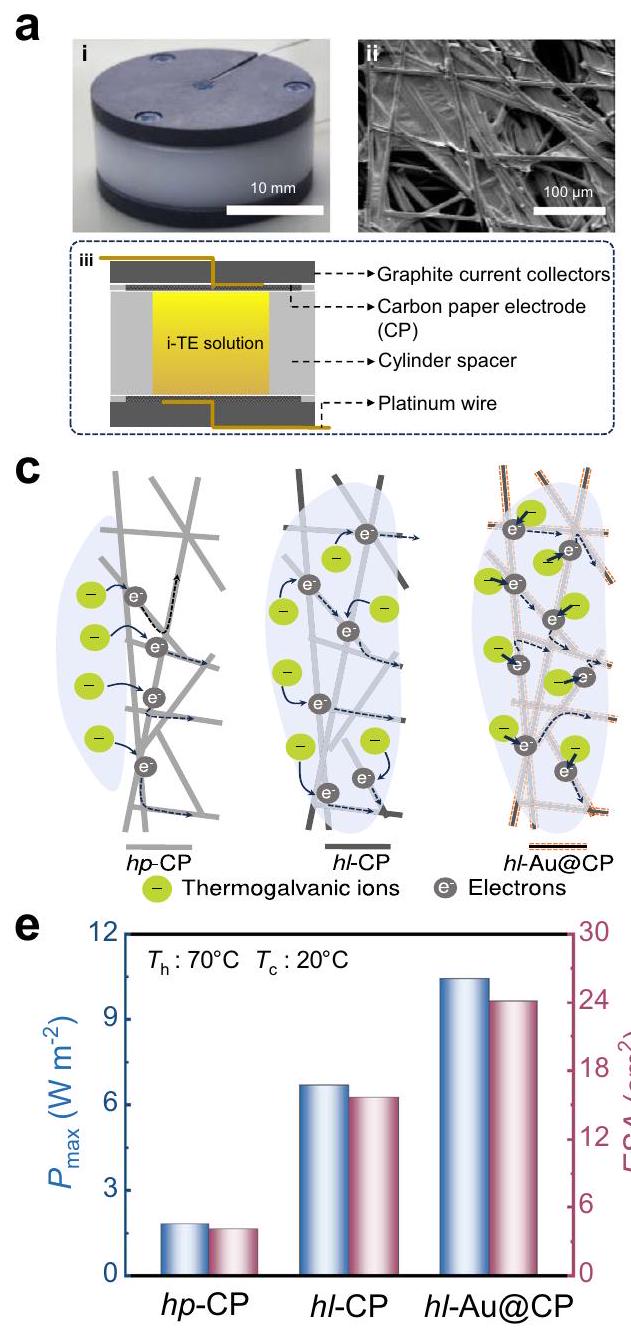 Next, a 40 -nm-thick Au layer was installed to reduce the electrodeinterface resistance relative to electron exchange between the redox couple. The porous structure of the asreceived CP (pore size ) was unaffected by the Au coating layer. For simplicity, this hydrophilic CP electrode with the thick Au coating is referenced as . The of the Au@CP | FAO | -Au@CP i-TE liquid cell ( ) was further improved to times higher than of the -CP cell (Fig. 2b). The schematic in Fig. 2c shows the effects of the hydrophilic treatment and gold-nanoparticle coating on the structure and properties of the CP electrode. The -CP electrode provides more electrochemically active sites than -CP because the surface energy between the electrode surface and electrolyte is higher for hl-CP than for hp-CP, promoting the infiltration of thermogalvanic ions into the internal microstructure. The gold nanoparticles on hl-Au@CP effectively reduce the electrode-interface resistance and accelerate the electron transfer process of the redox reaction . The electroactive surface area (ESA) can be determined from the peak current density ( ) in the cyclic voltammograms (CVs) of the electrodes (Fig. 2d). According to the Randles-Sevcik equation, a high faradaic peak current of an electrode exhibiting reversible kinetics indicates a high . The ESAs of the hp-CP, hl-CP, and hl-Au@CP electrodes were estimated as , and , respectively. Note that the values indicate only the performances of the CP electrodes, not their actual areas. In general, a higher ESA corresponds to a higher (Fig. 2e). Furthermore, the charge transfer resistances ( , diameter of the semicircle in a Nyquist plot) of the , and electrodes were 102,16 , and , respectively. The diffusioncontrolled impedance (Warburg impedance , reflected in the part of the Nyquist plot with a near- slope in the medium-high frequency domain) was much lower in the -Au@CP electrode ( ) than in the and electrodes, indicating fast electron transfer and ion diffusion within the -Au@CP electrode (Fig. 2f).