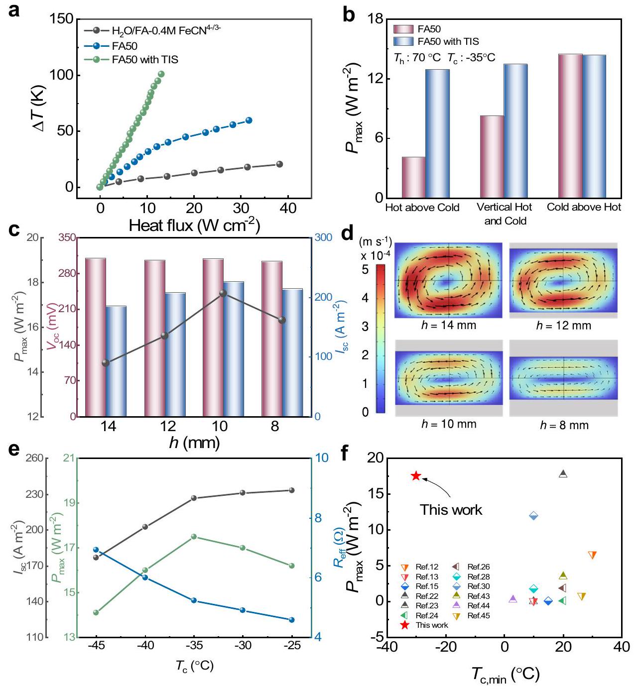 تعتمد أداء توليد الكهرباء لخلايا i-TE على مواد i-TE وفارق درجة الحرارة الفعال.يسمح الحمل الحراري في خلية السائل i-TE بالتشغيل المستمر لزوج الأكسدة والاختزاللكنها تقلل من المقاومة الحرارية وتخفض الـ. وبالتالي، فإن فجوة فصل الأقطاب الكهربائية والفاصل العازل حرارياً (TIS) هما مكونان رئيسيان في التصميم الهيكلي لخلايا السائل i-TE. على سبيل المثال، من خلال استخدام إسفنجة السليلوز المحبة للماء، قام باومان وآخرون بتحسين من الخلية من 63 إلى. هنا، تم غمر نسيج الألياف القطنية TIS في محلول i-TE لزيادة مقاومة الحرارة لخلايا السائل i-TE (الشكل التكميلي 16). يوضح الشكل 3a الفعالية عبر خلايا السائل i-TE مع وبدون TIS كدوال لتدفق الحرارة. كانت الخلايا المختبرة (FA50) و FA50 مع TIS. أولاً، يلاحظ أن GdmCl يزيد من من خلال تقليل الحمل الحراري. ثانياً، يقوم نظام العزل الحراري (TIS) بشكل فعال بكبح الحمل الحراري ويزيد من مقاومة الحرارة للخلايا (تم عرض الموصلية الحرارية للإلكتروليت والقطب الكهربائي في الجدول التكميلي 1). رفع نظام العزل الحراري الحد الأقصىخلية FA50 بواسطةمن تلك الخاصة بخلايا FA50 بدون TIS ( ضد تحت تدفق حراري قدره ). علاوة على ذلك، قام نظام TIS بتقليل حساسية خلية i-TE السائلة تجاه اتجاه تدرج الحرارة (الشكل 3ب)، مما يؤثر على توليد الطاقة في الخلية. عادةً، فإن وضع القطب البارد فوق القطب الساخن يحقق مستوى أعلى من بدلاً من وضع القطب الساخن فوق القطب البارد أو وضع الأقطاب الباردة والساخنة بشكل عمودي. في التكوين الأول، يساهم الخلط المستمر الناتج عن الحمل الحراري في تجانس الإلكتروليت وزيادة موصليته الأيونية.في هذه الدراسة، قام نظام TIS بتقليل الحمل الحراري من خلال الإلكتروليت وثبت ترسيب البلورات الحساسة للحرارة، لذا فإنكان غير حساس لاتجاه تدرج الحرارة.