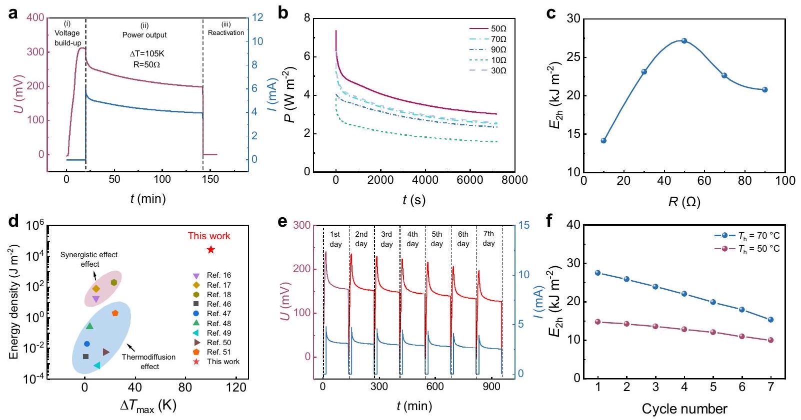 d Performance comparison of energy density between the proposed i-TE cell and reported i-TE cells based on thermodiffusion or synergistic effects . e Measured voltage and current curves during one week of continuous cycling ( ). Decay of two-hour energy output of the i-TE liquid cell during one week of cyclic service at and .