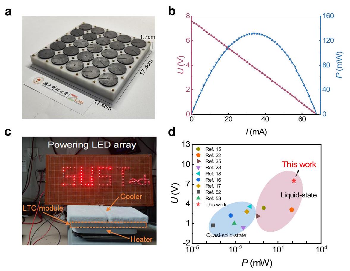 Finally, the optimized i-TE liquid cell, namely, Au@CP ( ), was assembled into a 25 -cell i-TE module (Fig. 5a). The , and produced by the module were , and 131 mW , respectively, with ( and ) (Fig. 5b). Owing to its considerable output power, the module could directly drive a light-emitting diode (LED) array (Fig. 5c). This test demonstrates that our device can power electronics near cryo temperatures, confirming its practical utility. Figure 5d compares the voltage and power of our as-fabricated i-TE liquid cell module devices with those of other reported i-TE and e-TE devices . Our module doubled the voltage from those of the reported devices based on other i-TE systems. Our work extends the application scenarios of i-TE liquid cells to the extremely cold regime, potentially realizing selfpowered supplies that harvest waste heat for IoT sensors in extremely cold environments. Our work also promises scientific activity in frigid polar regions.