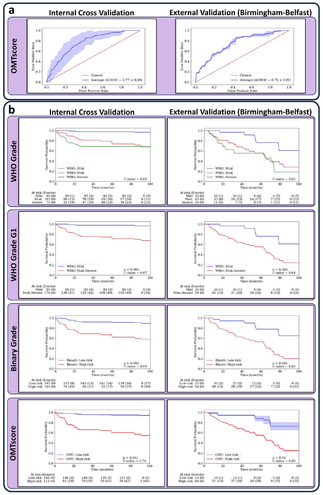 (right) for the predictions from the WHO 2017 grade (top), WHO grade G1 (mild vs. moderate/severe), the binary grade and the OMTscore (bottom). Confidence intervals supplied for the OMTscore output AUROC/Kaplan-Meier curves are generated by the standard deviation of the model output over repeated runs of the experiment.