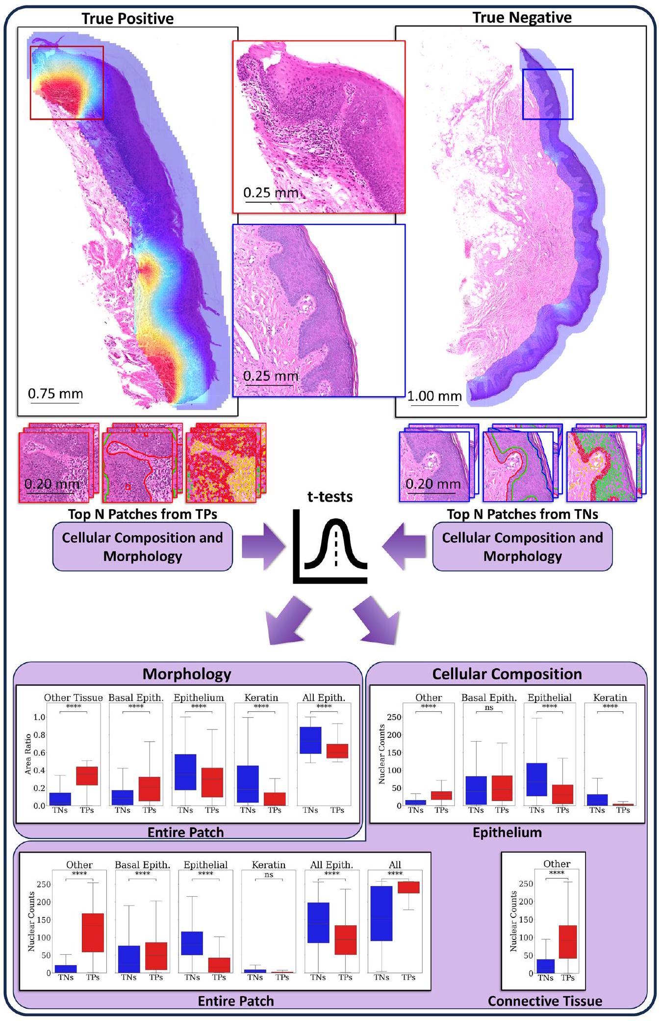 correction) were used to determine any differences. The bottom of the image has boxplots showing the distribution of nuclear counts (cellular composition) within the entire patch, the epithelium alone, and the connective tissue alone, of the top five predicted patches from true positive (TP) cases, and the top five patches from true negatives (TNs). We additionally give boxplots showing the distribution of area ratios (morphology) within the top five predicted patches from TPs, and the top five patches from TNs.