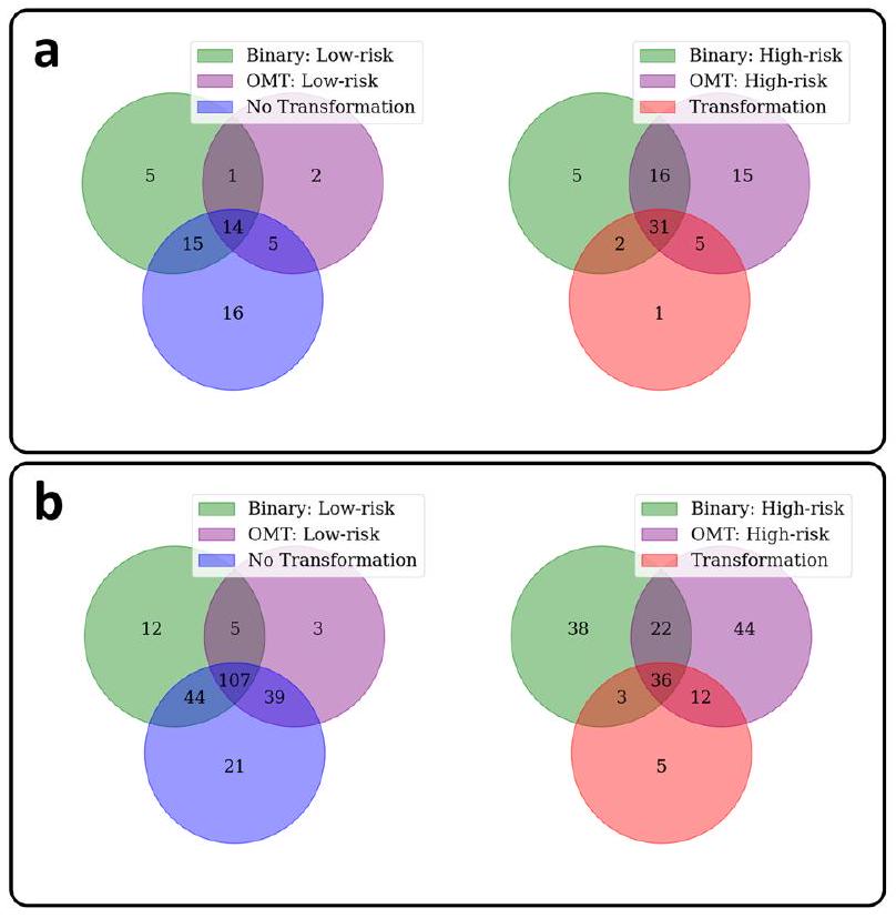 تسلل لمفاوي بارز داخل الظهارة وخلايا لمفاوية محيطية. نقدم أيضًا مخططات فين تظهر تداخل تصنيفات المرضى بناءً على الدرجة الثنائية وOMTscore في التحقق الداخلي والخارجي في الشكل 4. من الواضح أن كل من خط أنابيبنا والدرجات الثنائية تتنبأ بشكل متكرر بنفس الشرائح على أنها عالية المخاطر، مع تداخل كبير، ولكن مع كون OMTscore أكثر حساسية من الدرجة الثنائية.