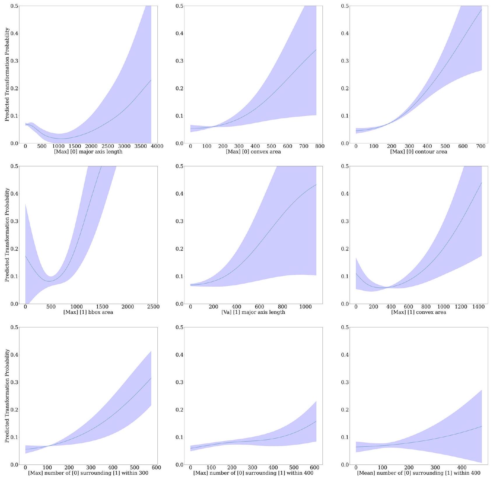 لتحديد أهم الميزات المستخدمة من قبل النموذج في التنبؤ بالتحول الخبيث، قمنا بإجراء عدة تحليلات. أولاً، نقارن التركيب الخلوي والشكلية للبقع الأكثر تنبؤًا في الحالات التي تم التنبؤ بها بشكل صحيح. ثانيًا، نظرنا في أهمية الميزات لـ 168 ميزة شكلية/مكانية، استنادًا إلى مصنف الغابة العشوائية (انظر المواد التكميلية ص 5). ثالثًا، ندرس مخططات احتمالية الاعتماد الجزئي (PDPs)، لتحديد تأثير كل ميزة على النتيجة المتوقعة بشكل منفصل. معًا، تعطي هذه التحليلات مزيدًا من التفسير لتنبؤات النماذج.