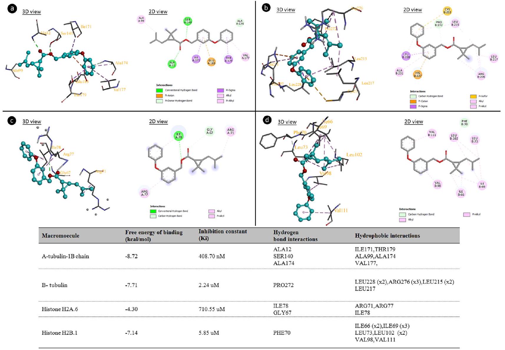 proteins can also lead to disruption of microtubule polymerization. The possible interaction of permethrin with tubulin proteins leads to abnormalities in the polypeptide structure. As a result of this abnormality, microtubule polymerization is prevented and chromosome movement to the poles is restricted, leading to disruption of mitotic stages and chromosome abnormalities. Permethrin-tubulin interactions are the basis for the cytotoxic impact of permethrin, which is demonstrated by a reduction in the rate of MI in A. cepa. The genotoxic effect of permethrin may occur as a result of permethrin-histone (Fig. 5) and permethrin-DNA interactions (Fig. 6). Permethrin has binding energies of -4.30 and