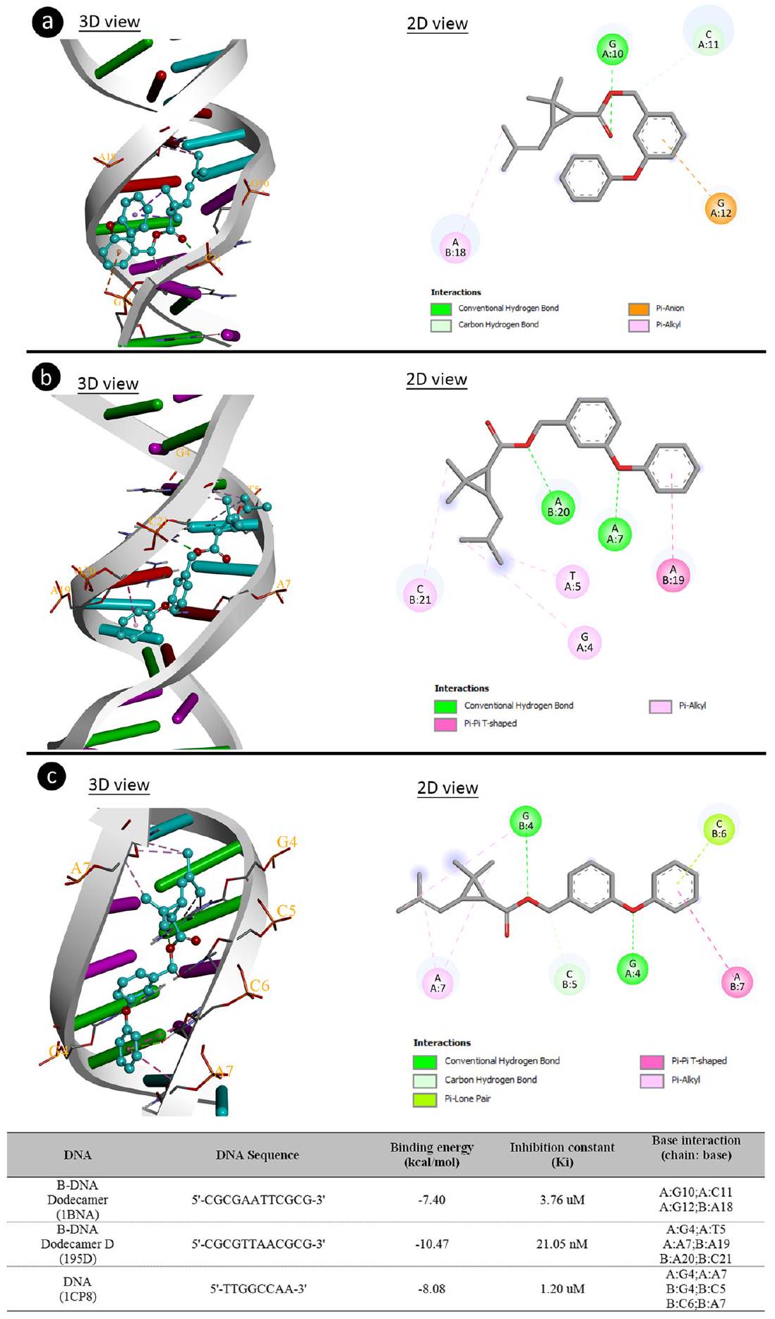البروتينات أيضًا إلى تعطيل تجميع الأنابيب الدقيقة. إن التفاعل المحتمل للبيرميثرين مع بروتينات التوبولين يؤدي إلى شذوذ في بنية البوليببتيد. نتيجة لهذا الشذوذ، يتم منع تجميع الأنابيب الدقيقة ويتم تقييد حركة الكروموسومات نحو الأقطاب، مما يؤدي إلى تعطيل المراحل الميتوزية والشذوذ الكروموسومي. تعتبر تفاعلات البيرميثرين-التوبولين أساس التأثير السمي للبيرميثرين، والذي يتجلى من خلال انخفاض معدل MI في A. cepa. قد يحدث التأثير الجيني للبيرميثرين نتيجة لتفاعلات البيرميثرين-الهيستون (الشكل 5) وتفاعلات البيرميثرين-DNA (الشكل 6). يتمتع البيرميثرين بالطاقة الربطية -4.30 و