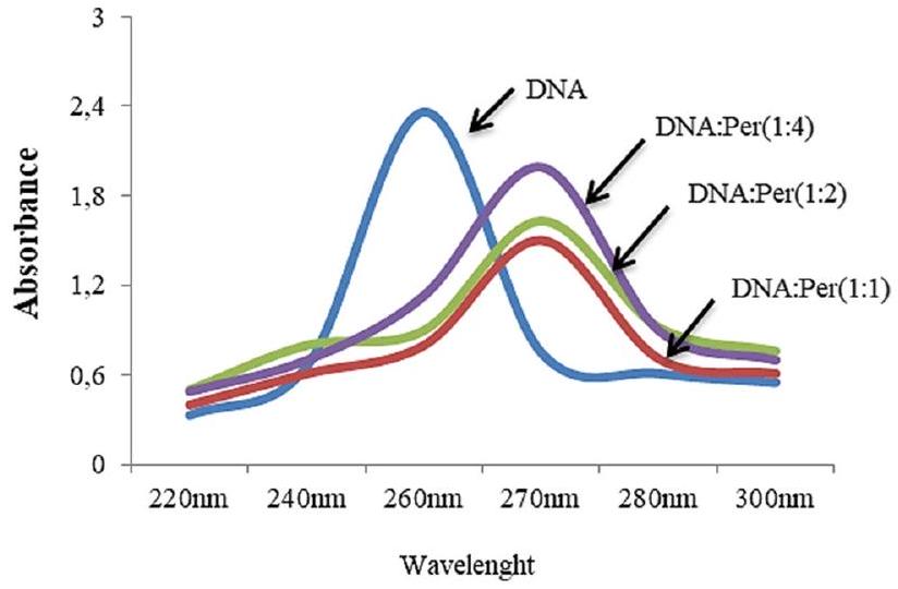 spectrum of DNA isolated from Allium were investigated. DNA was isolated from root tip cells of A. cepa according to the method developed by Sharma et al. (2002). DNApermethrin interactions were evaluated by measuring the absorbances of the DNA solution at different wavelengths in the presence and absence of permethrin (DNA/permethrin,
