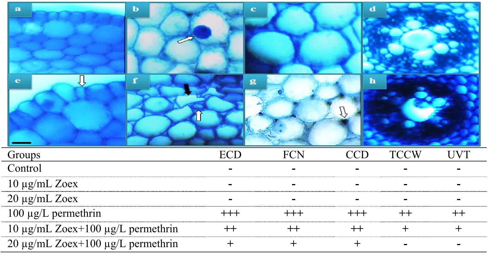 this change acts as a barrier against harmful chemicals and prevents toxic compounds from entering the vascular tissue. Nuclear shape change is another abnormality, and genotoxic and biochemical changes induced by permethrin may be the cause of nuclear flattening. Changes in nuclear shape may result from deterioration of nuclear volume, protein concentration, DNA integrity, and density (Dahl et al. 2008; Dauer and Worman 2009). Similarly, Yalçın et al. (2019) found that numerous morphological changes, such as deformation of epidermal cells and thickening of cell walls, were observed in root anatomy under chemicalinduced stress. Other abnormalities caused by permethrin include disorganized vascular tissue and cellular damage to the epidermis. The cause of all these abnormalities could be permethrin-induced oxidative stress, cytotoxic, and genotoxic effects. Such anatomical abnormalities prevent the plant from taking up nutrients and transporting them to other tissues and may also retard growth. Zoex application with permethrin resulted in a decrease in the incidence of anatomical damage. The application of
