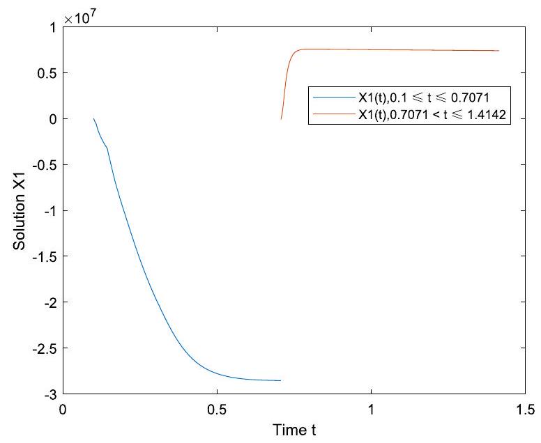 By applying the algorithm in Sect. 5.1 and the ODE45 toolbox in MATLAB 2018b, we have provided numerical simulations of the solution for system (5.6), as shown in Figs. 1 and 2 . The simulation shows that the solution of system (1.1) is discontinuous at impulsive point .