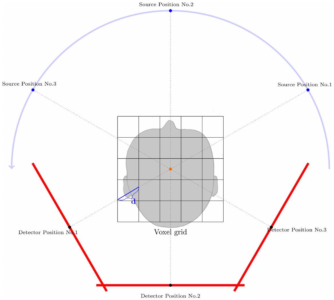 بعد ترتيب جميع مواقع المصدر والكاشف تقريبًا حول شبكة الفوكسل الافتراضية وفقًا للمواقع الحقيقية التي كانت فعالة لكل واحدة من مئات صور الأشعة السينية (الشكل 1)، يتم بناء خط من كل بكسل كاشف يهدف إلى الموقع ثلاثي الأبعاد لمصدر الأشعة السينية. لكل فوكسل وإسقاط k (أي، موقع المصدر إلى الكاشف رقم k) يتم حساب مسافة