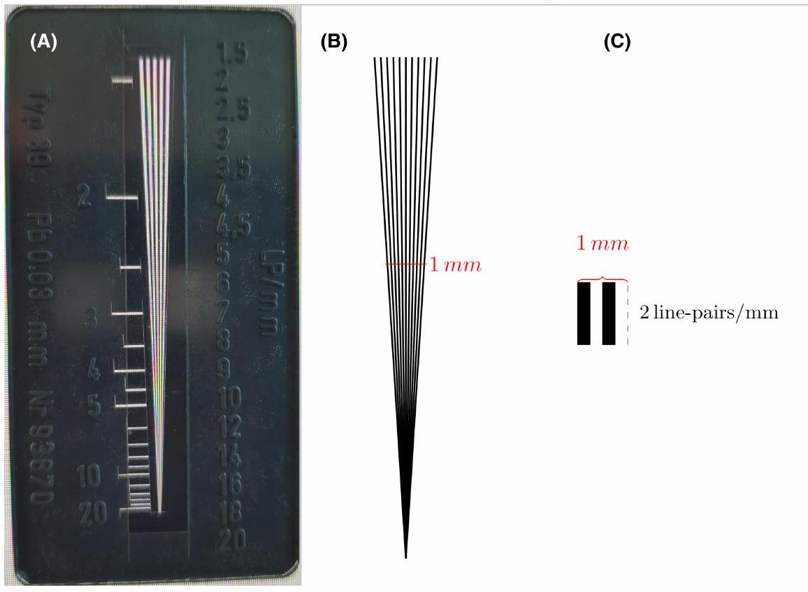 طريقة. بينما تقوم الطريقة الأولى بتقييم بصري لعدد الخطوط القابلة للإدراك لكل مليمتر في صورة وهمية (الشكل 2)، فإن الأخيرة هي مقياس يمكن تقييمه تلقائيًا وموضوعيًا من صور وهمية محددة. بعبارة أخرى، تقيس MTF الدقة المكانية بالنسبة إلى (التباين) المعياري. بينما تنتج مخرجاتها في “دورات لكل مليمتر”، يمكن ترجمتها بأمان إلى “أزواج الخطوط لكل مليمتر” أيضًا. عادةً ما ترتبط الدقة المكانية المحدودة بالقيمة التي تنخفض عندها MTF إلى