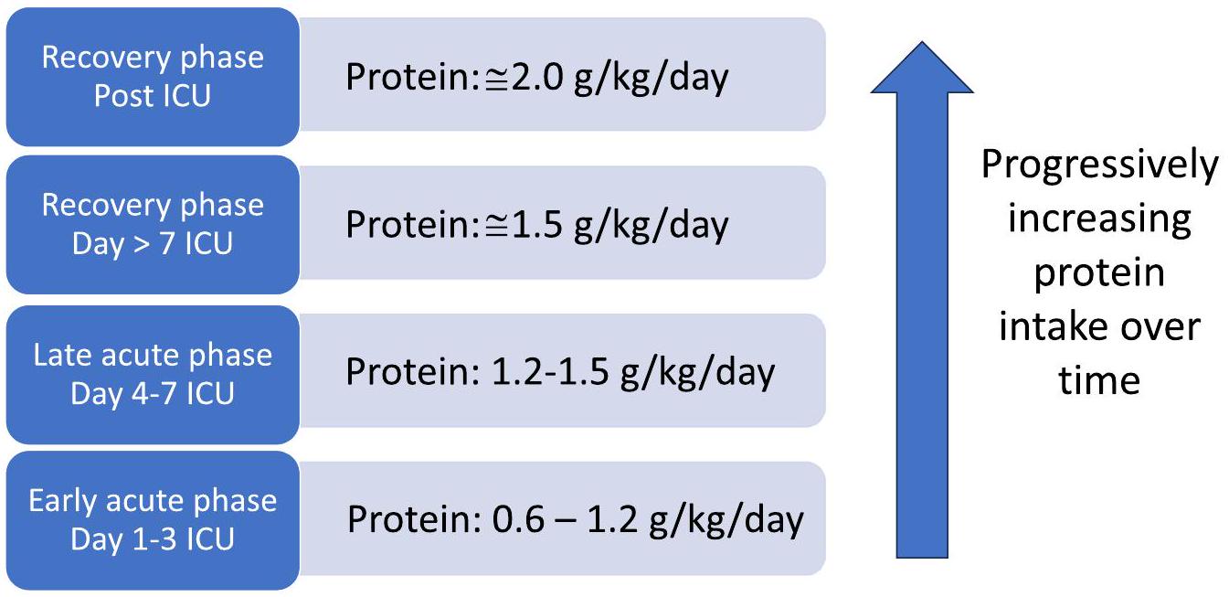 لا يزال النقاش حول الاستراتيجية المثلى للتغذية للمرضى الذين يعانون من حالات حرجة مستمراً، ولكن يجب تكييف التغذية مع احتياجات كل مريض على حدة. المرضى الذين يعانون من حالات حرجة معرضون لخطر انهيار العضلات، مما يؤدي إلى فقدان كتلة العضلات وتأثيراتها السريرية الناتجة. تم استكشاف توقيت بدء التغذية وأهداف البروتين في التجارب الأخيرة. تشير هذه التجارب إلى أن توفير البروتين “المعتدل” (الحد الأقصى